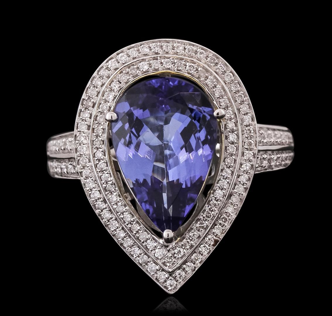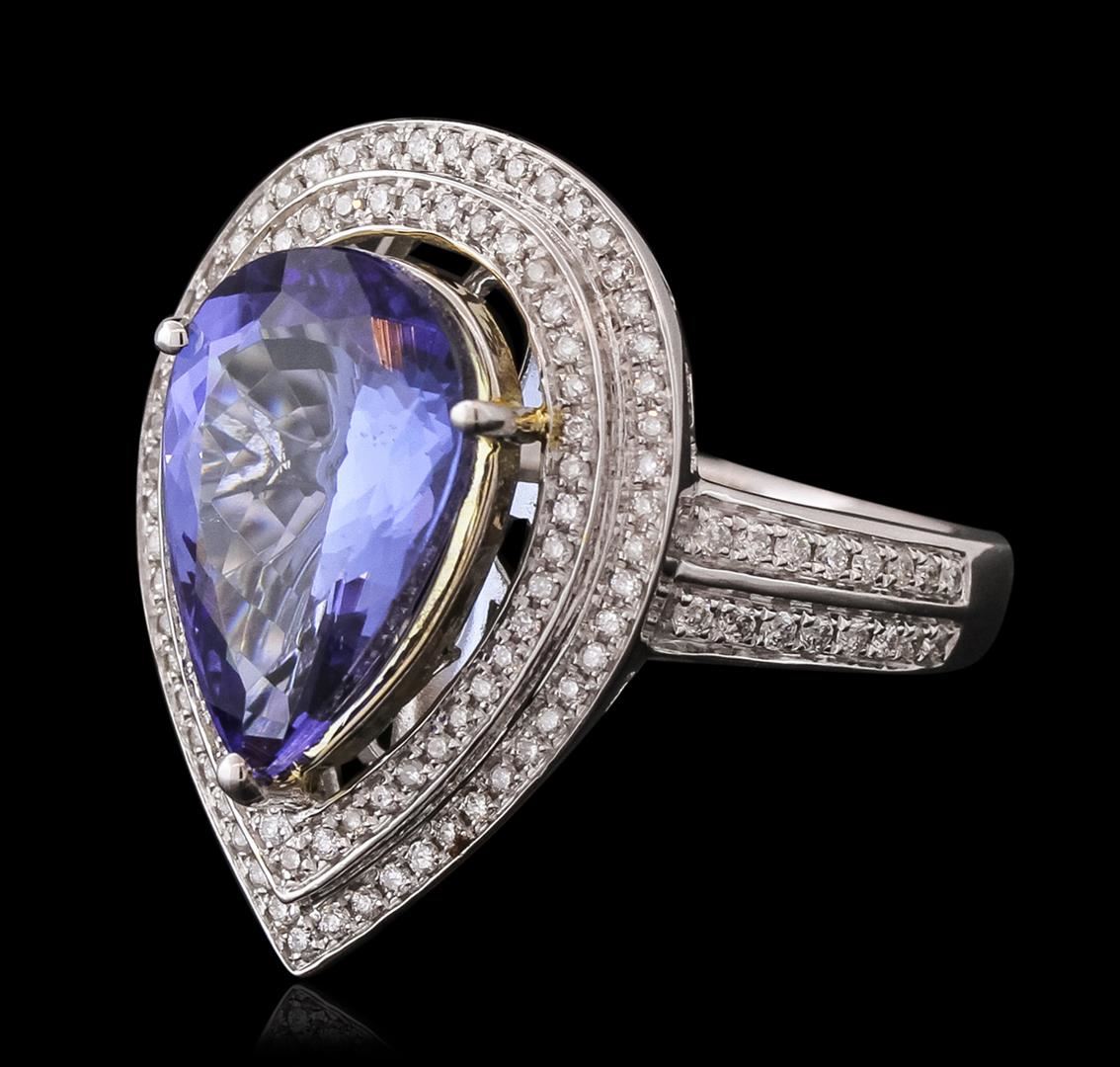 One electronically tested 14KT white and yellow gold ladies combination cast & assembled tanzanite and diamond ring with a flat shank with a bright polish finish. Identified with markings of "14K". Condition is new. Containing: One prong set pear modified brilliant cut natural tanzanite, measuring 13.56 x 9.33 x 4.99mm, approximate weight of 4.23ct., clarity is eye clean, type I, medium, very slightly grayish, violet color, (GIA V 5/3), cut is good. One Hundred Twenty-Eight prong set round brilliant cut diamonds, measuring 1.10 - 1.10 x 0.66mm (depth est.) stated total weight of 128 Stones = 0.61ct. Clarity: I-1 to I-2. Color: I - J, Cut is Good. Colored gemstones are presumed to have been subjected to commonly used enhancement processes. All diamonds and colored gemstones are graded in the mounting, unless otherwise stated total weight of Colored Stones 4.23ct. Total Weight of Diamonds 0.61ct. Total Weight of Ring 8.60 grams. GGL Appraised at $10,090.00.
