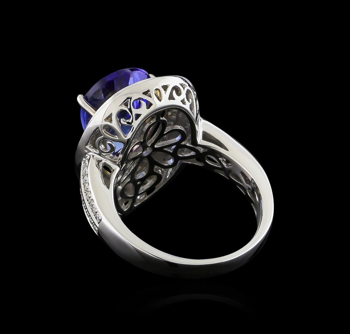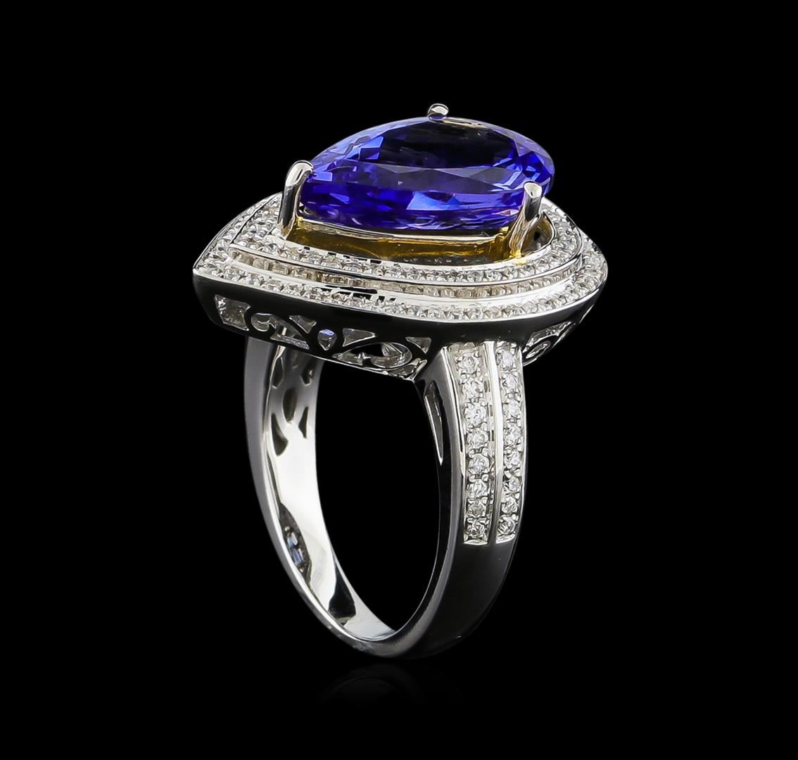 One electronically tested 14KT white and yellow gold ladies combination cast & assembled tanzanite and diamond ring with a flat shank with a bright polish finish. Identified with markings of "14K". Condition is new. Containing: One prong set pear modified brilliant cut natural tanzanite, measuring 13.56 x 9.33 x 4.99mm, approximate weight of 4.23ct., clarity is eye clean, type I, medium, very slightly grayish, violet color, (GIA V 5/3), cut is good. One Hundred Twenty-Eight prong set round brilliant cut diamonds, measuring 1.10 - 1.10 x 0.66mm (depth est.) stated total weight of 128 Stones = 0.61ct. Clarity: I-1 to I-2. Color: I - J, Cut is Good. Colored gemstones are presumed to have been subjected to commonly used enhancement processes. All diamonds and colored gemstones are graded in the mounting, unless otherwise stated total weight of Colored Stones 4.23ct. Total Weight of Diamonds 0.61ct. Total Weight of Ring 8.60 grams. GGL Appraised at $10,090.00.