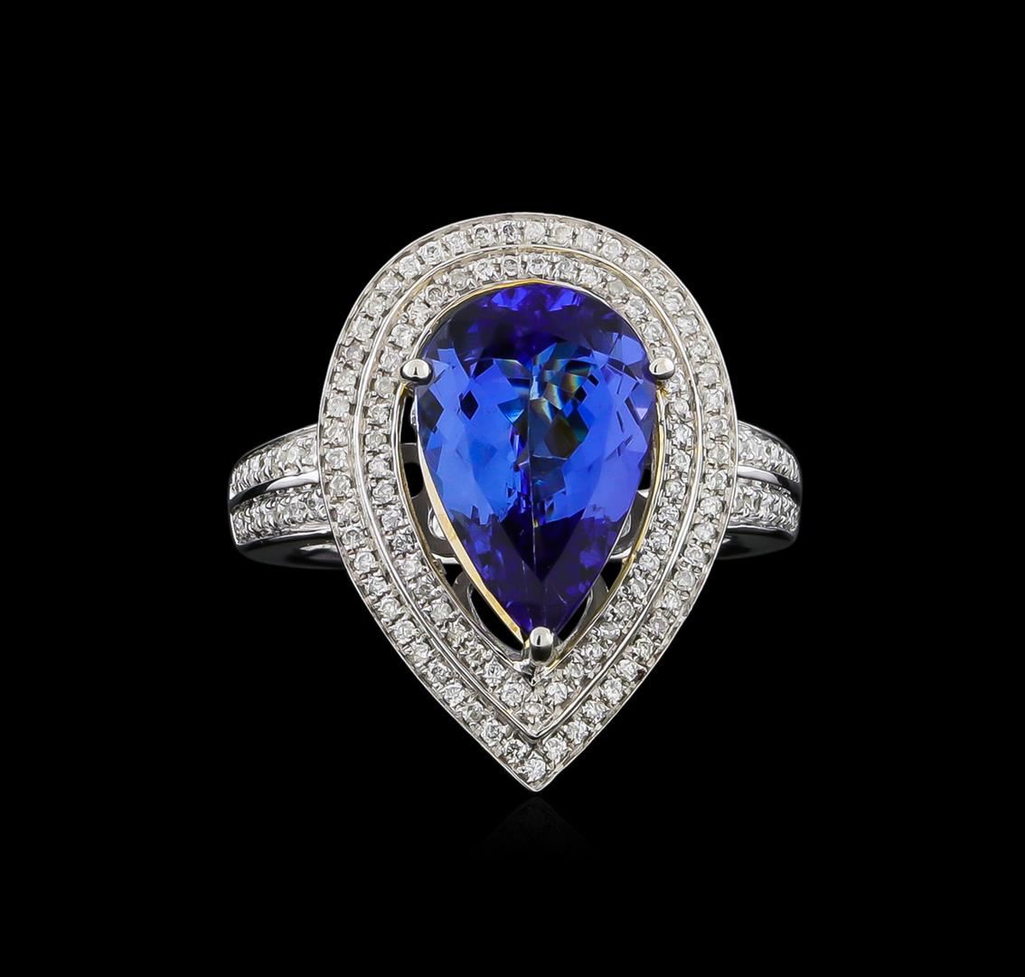 One electronically tested 14KT white and yellow gold ladies combination cast & assembled tanzanite and diamond ring with a flat shank with a bright polish finish. Identified with markings of "14K". Condition is new. Containing: One prong set pear modified brilliant cut natural tanzanite, measuring 13.56 x 9.33 x 4.99mm, approximate weight of 4.23ct., clarity is eye clean, type I, medium, very slightly grayish, violet color, (GIA V 5/3), cut is good. One Hundred Twenty-Eight prong set round brilliant cut diamonds, measuring 1.10 - 1.10 x 0.66mm (depth est.) stated total weight of 128 Stones = 0.61ct. Clarity: I-1 to I-2. Color: I - J, Cut is Good. Colored gemstones are presumed to have been subjected to commonly used enhancement processes. All diamonds and colored gemstones are graded in the mounting, unless otherwise stated total weight of Colored Stones 4.23ct. Total Weight of Diamonds 0.61ct. Total Weight of Ring 8.60 grams. GGL Appraised at $10,090.00.