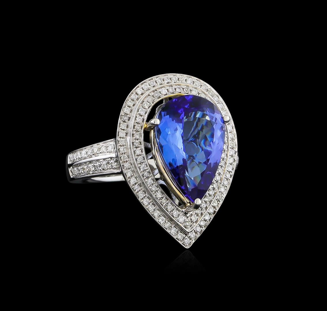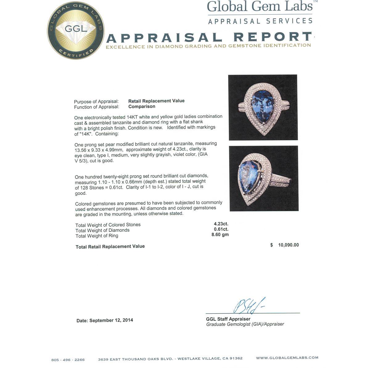 One electronically tested 14KT white and yellow gold ladies combination cast & assembled tanzanite and diamond ring with a flat shank with a bright polish finish. Identified with markings of "14K". Condition is new. Containing: One prong set pear modified brilliant cut natural tanzanite, measuring 13.56 x 9.33 x 4.99mm, approximate weight of 4.23ct., clarity is eye clean, type I, medium, very slightly grayish, violet color, (GIA V 5/3), cut is good. One Hundred Twenty-Eight prong set round brilliant cut diamonds, measuring 1.10 - 1.10 x 0.66mm (depth est.) stated total weight of 128 Stones = 0.61ct. Clarity: I-1 to I-2. Color: I - J, Cut is Good. Colored gemstones are presumed to have been subjected to commonly used enhancement processes. All diamonds and colored gemstones are graded in the mounting, unless otherwise stated total weight of Colored Stones 4.23ct. Total Weight of Diamonds 0.61ct. Total Weight of Ring 8.60 grams. GGL Appraised at $10,090.00.