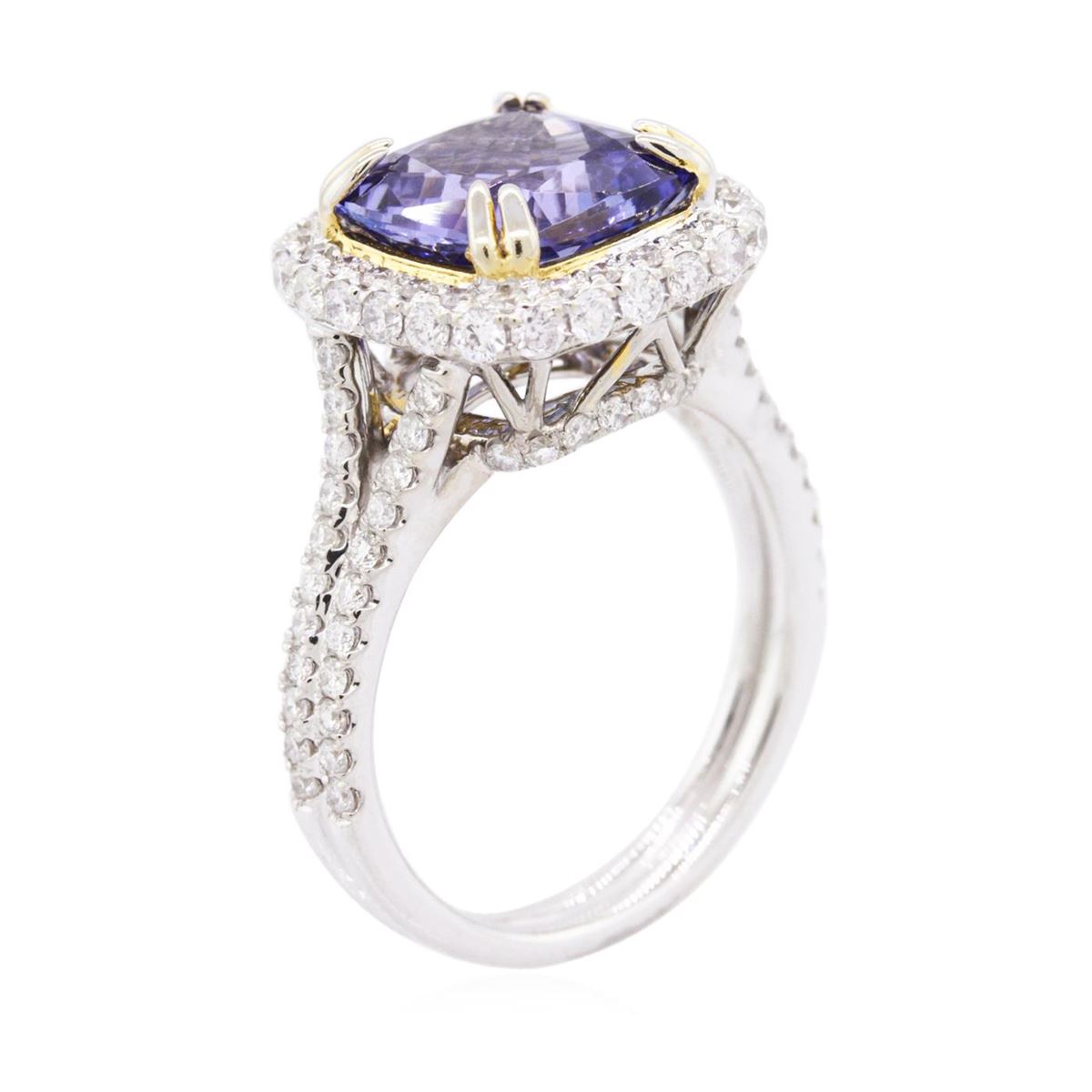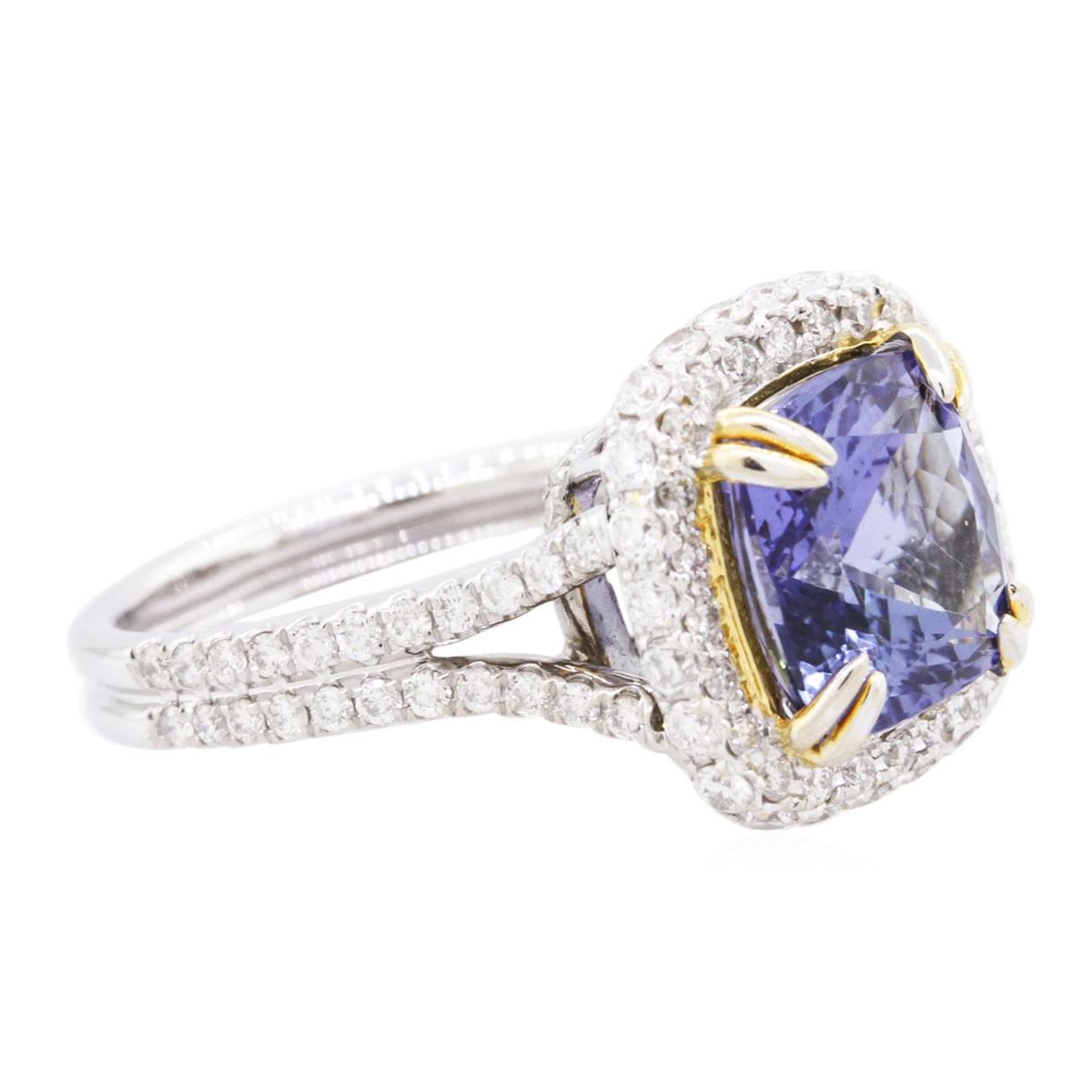 One electronically tested 14KT white and yellow gold ladies combination cast & assembled tanzanite and diamond ring with a split shank with a bright polish finish. Identified with markings of "14K". Condition is new. Containing: One prong set oval square cushion modified brilliant cut natural tanzanite, measuring 9.43 x 9.43 x 6.13mm, approximate weight of 4.29ct., clarity is eye clean, type I, medium light, very slightly grayish, violet color, (GIA V 4/3), cut is good. Ninety-Nine prong set round brilliant cut diamonds, measuring 1.50 - 1.20 x 0.81mm (depth est.) approximate total weight of 99 Stones = 0.89ct. Clarity: SI-2 to I-1. Color: I - J, Cut is Good. Colored gemstones are presumed to have been subjected to commonly used enhancement processes. All diamonds and colored gemstones are graded in the mounting, unless otherwise stated. Total Weight of Colored Stones 4.29ct. Total Weight of Diamonds 0.89ct. Total Weight of Ring 6.10 grams. GGL Appraised at $9,700.00.