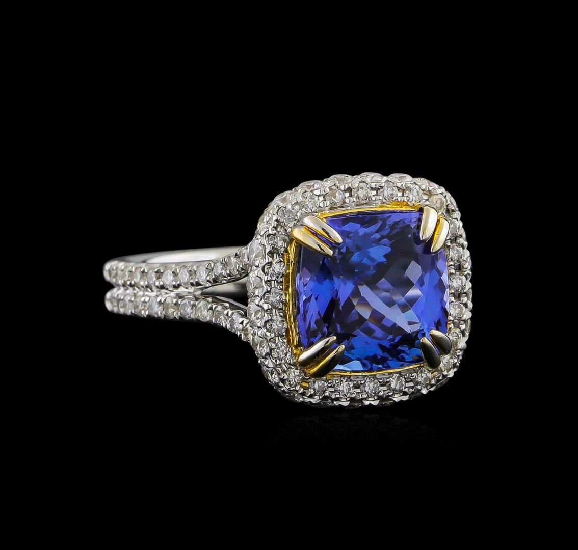 One electronically tested 14KT white and yellow gold ladies combination cast & assembled tanzanite and diamond ring with a split shank with a bright polish finish. Identified with markings of "14K". Condition is new. Containing: One prong set oval square cushion modified brilliant cut natural tanzanite, measuring 9.43 x 9.43 x 6.13mm, approximate weight of 4.29ct., clarity is eye clean, type I, medium light, very slightly grayish, violet color, (GIA V 4/3), cut is good. Ninety-Nine prong set round brilliant cut diamonds, measuring 1.50 - 1.20 x 0.81mm (depth est.) approximate total weight of 99 Stones = 0.89ct. Clarity: SI-2 to I-1. Color: I - J, Cut is Good. Colored gemstones are presumed to have been subjected to commonly used enhancement processes. All diamonds and colored gemstones are graded in the mounting, unless otherwise stated. Total Weight of Colored Stones 4.29ct. Total Weight of Diamonds 0.89ct. Total Weight of Ring 6.10 grams. GGL Appraised at $9,700.00.