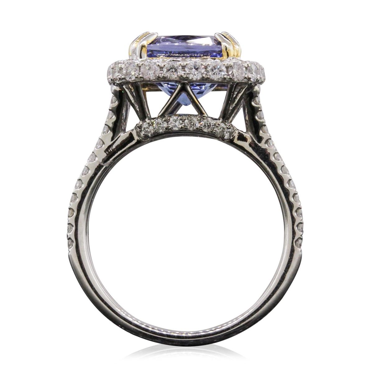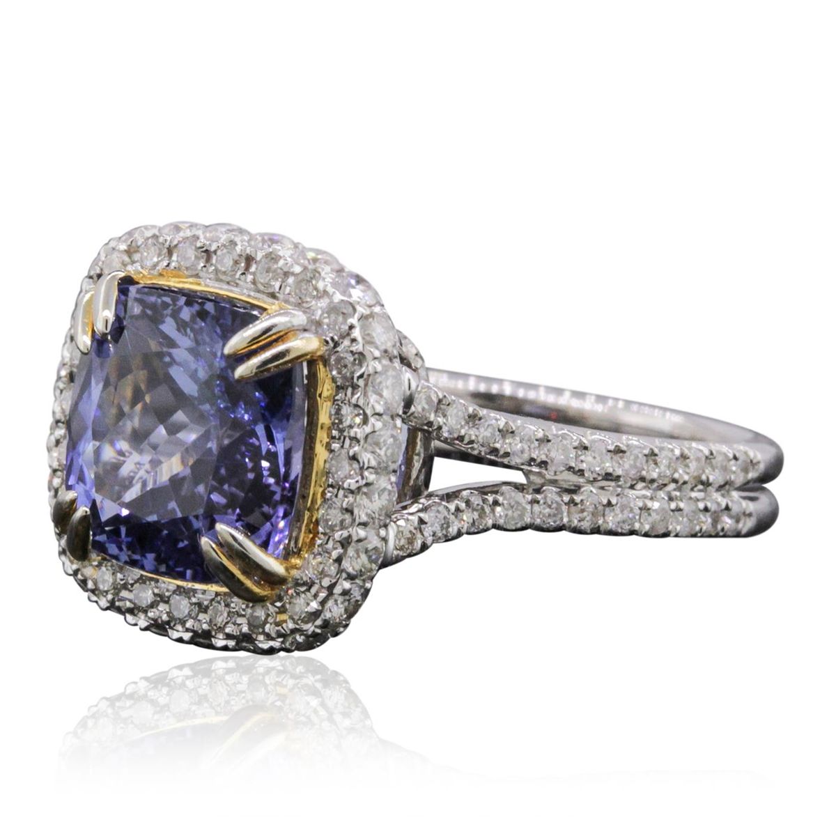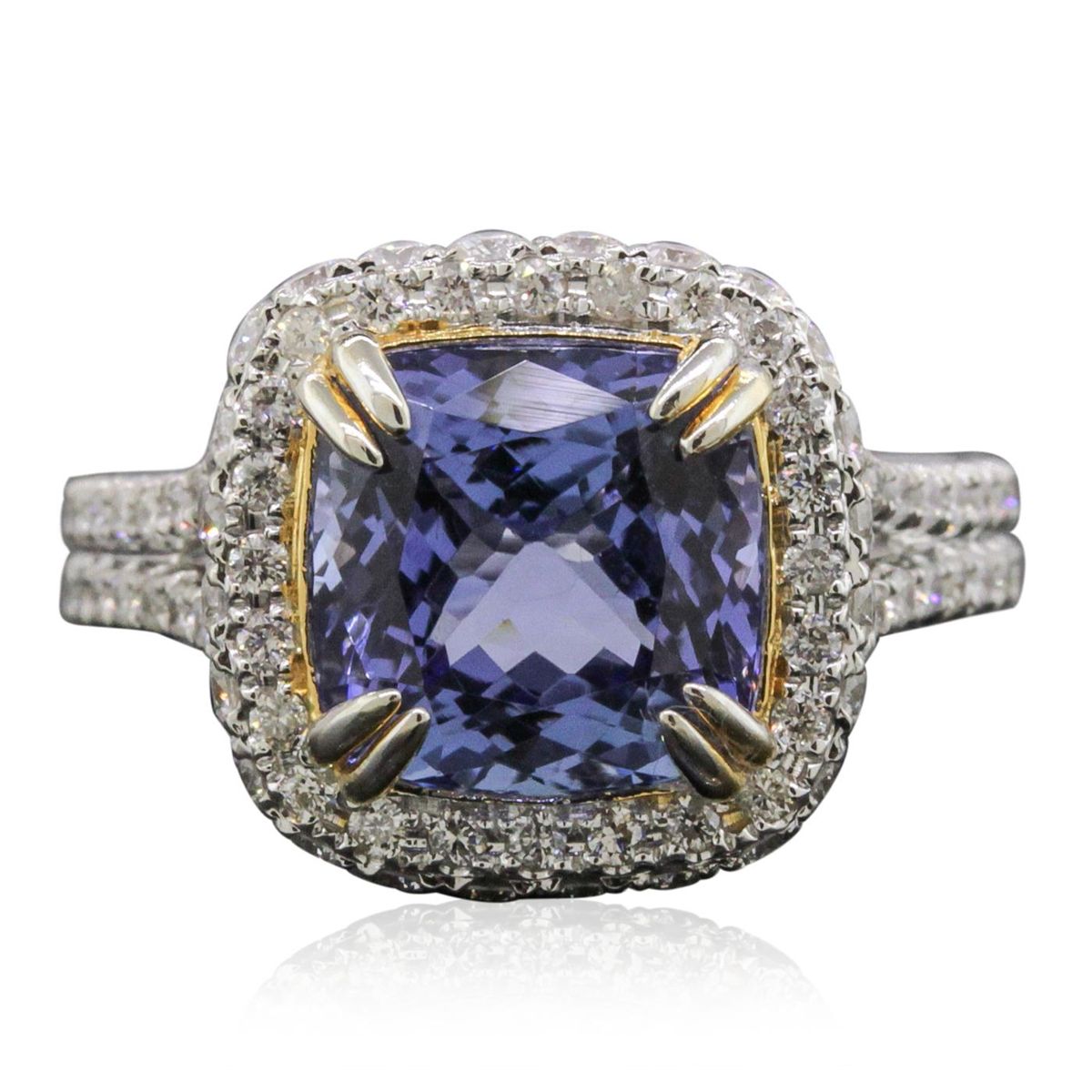 One electronically tested 14KT white and yellow gold ladies combination cast & assembled tanzanite and diamond ring with a split shank with a bright polish finish. Identified with markings of "14K". Condition is new. Containing: One prong set oval square cushion modified brilliant cut natural tanzanite, measuring 9.43 x 9.43 x 6.13mm, approximate weight of 4.29ct., clarity is eye clean, type I, medium light, very slightly grayish, violet color, (GIA V 4/3), cut is good. Ninety-Nine prong set round brilliant cut diamonds, measuring 1.50 - 1.20 x 0.81mm (depth est.) approximate total weight of 99 Stones = 0.89ct. Clarity: SI-2 to I-1. Color: I - J, Cut is Good. Colored gemstones are presumed to have been subjected to commonly used enhancement processes. All diamonds and colored gemstones are graded in the mounting, unless otherwise stated. Total Weight of Colored Stones 4.29ct. Total Weight of Diamonds 0.89ct. Total Weight of Ring 6.10 grams. GGL Appraised at $9,700.00.