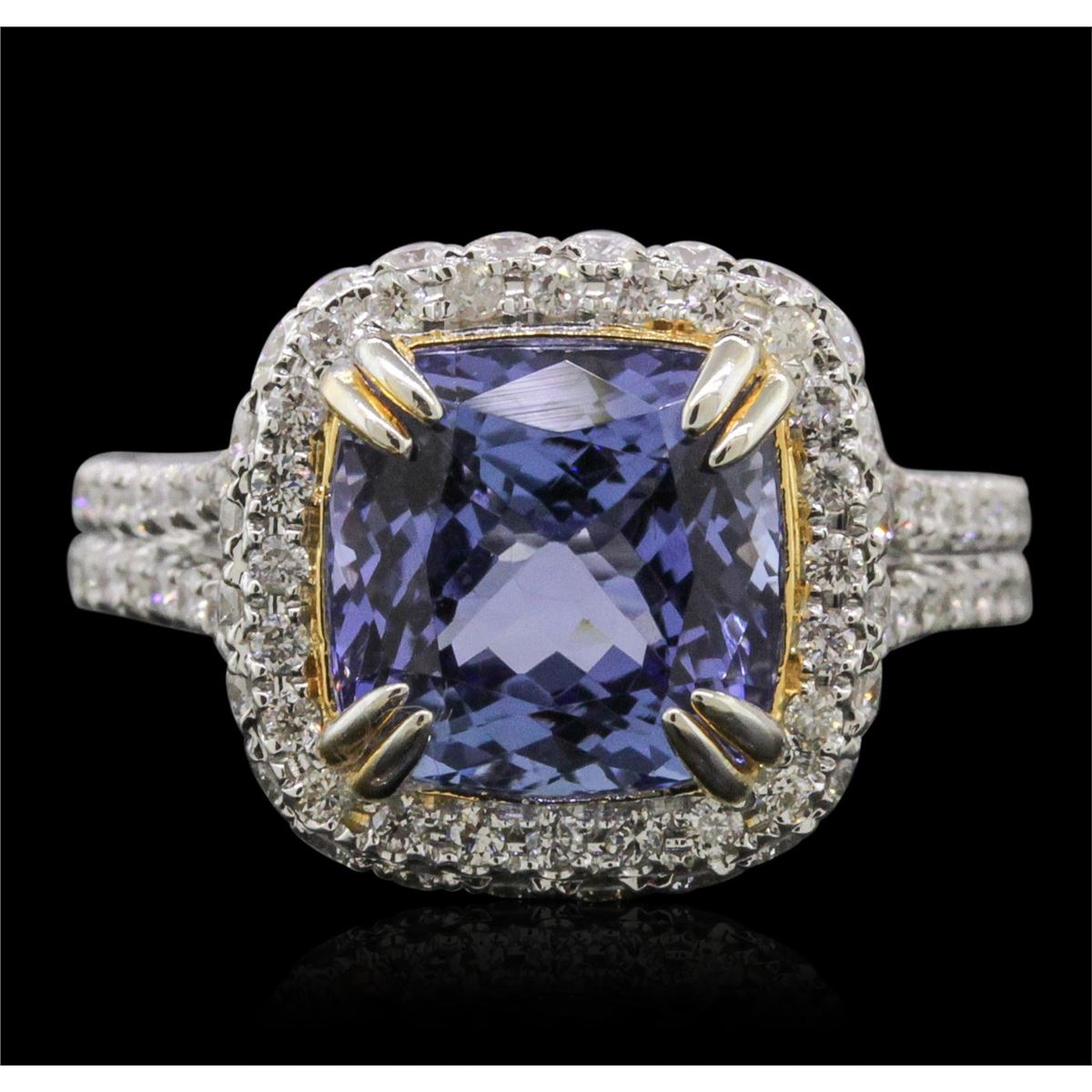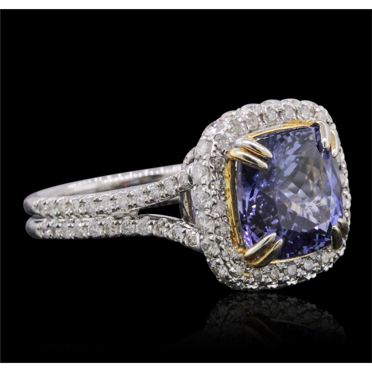 One electronically tested 14KT white and yellow gold ladies combination cast & assembled tanzanite and diamond ring with a split shank with a bright polish finish. Identified with markings of "14K". Condition is new. Containing: One prong set oval square cushion modified brilliant cut natural tanzanite, measuring 9.43 x 9.43 x 6.13mm, approximate weight of 4.29ct., clarity is eye clean, type I, medium light, very slightly grayish, violet color, (GIA V 4/3), cut is good. Ninety-Nine prong set round brilliant cut diamonds, measuring 1.50 - 1.20 x 0.81mm (depth est.) approximate total weight of 99 Stones = 0.89ct. Clarity: SI-2 to I-1. Color: I - J, Cut is Good. Colored gemstones are presumed to have been subjected to commonly used enhancement processes. All diamonds and colored gemstones are graded in the mounting, unless otherwise stated. Total Weight of Colored Stones 4.29ct. Total Weight of Diamonds 0.89ct. Total Weight of Ring 6.10 grams. GGL Appraised at $9,700.00.