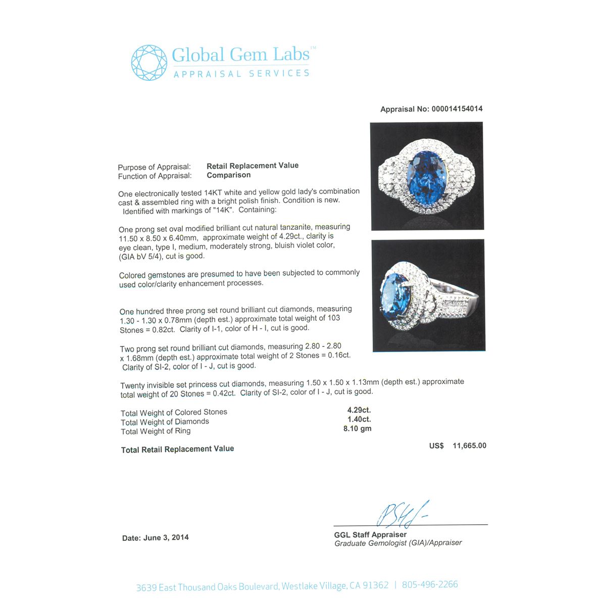One electronically tested 14KT white and yellow gold Ladies combination cast & assembled ring with a bright polish finish. Condition is new. Identified with markings of "14K". Containing: One prong set oval modified brilliant cut natural tanzanite, measuring 11.50 x 8.50 x 6.40mm, approximate weight of 4.29ct., clarity is eye clean, type I, medium, moderately strong, bluish violet color, (GIA bV 5/4), cut is good. Colored gemstones are presumed to have been subjected to commonly used color/clarity enhancement processes. One Hundred Three prong set round brilliant cut diamonds, measuring 1.30 - 1.30 x 0.78mm (depth est.) approximate. Total Weight of 103 Stones = 0.82ct. Clarity: I-1. Color: H - I, Cut is Good. Two prong set round brilliant cut diamonds, measuring 2.80 - 2.80 x 1.68mm (depth est.) approximate. Total Weight of 2 Stones = 0.16ct. Clarity: SI-2. Color: I - J, Cut is Good. Twenty invisible set princess cut diamonds, measuring 1.50 x 1.50 x 1.13mm (depth est.) approximate. Total Weight of 20 Stones = 0.42ct. Clarity: SI-2. Color: I - J, Cut is Good. Total Weight of Colored Stones 4.29ct. Total Weight of Diamonds 1.40ct. Total Weight of Ring 8.10 grams. GGL Appraised at $11,665.00.