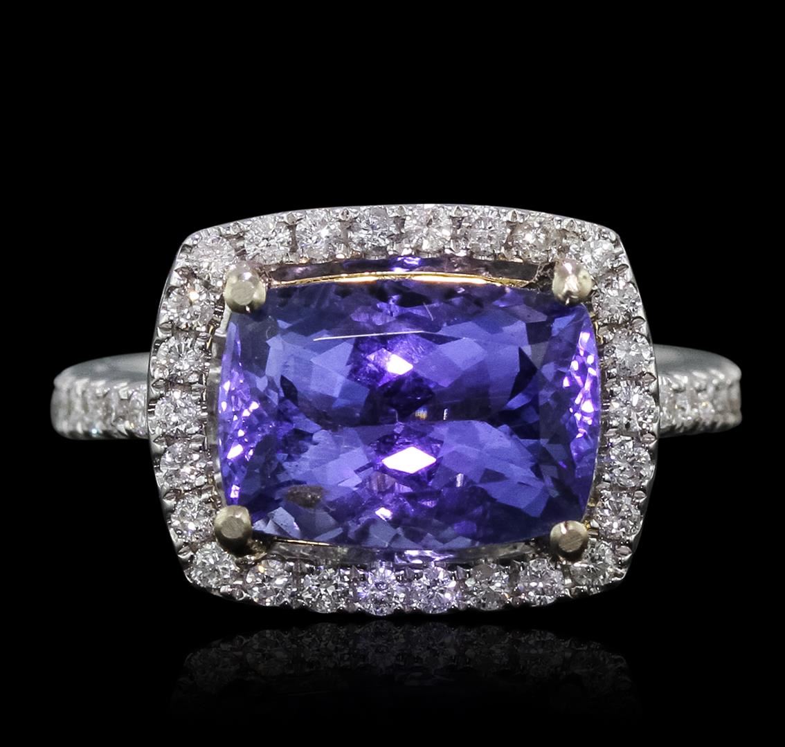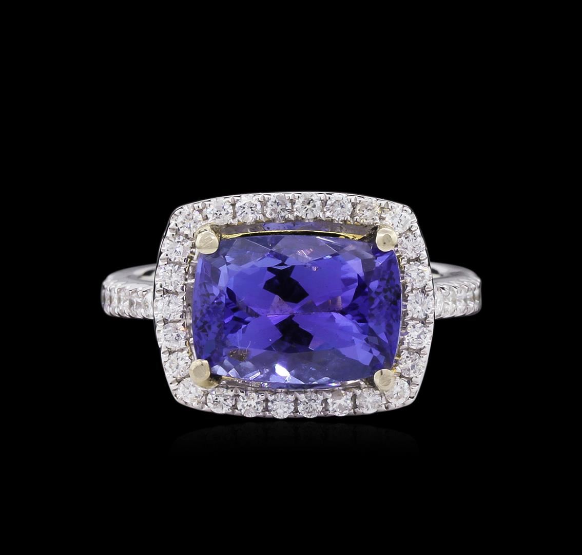 One electronically tested 14KT white and yellow gold Ladies combination cast & assembled ring with a bright polish finish. Condition is new. Identified with markings of "14K". Containing: One prong set rectangular cushion modified brilliant cut natural tanzanite, measuring 11.40 x 8.10 x 5.90mm, approximate weight of 4.29ct., clarity is eye clean, type I, medium light, moderately strong, violet color, (GIA V 4/4), cut is good. Colored gemstones are presumed to have been subjected to commonly used color/clarity enhancement processes. Forty prong set round brilliant cut diamonds, measuring 1.50 - 1.30 x 0.84mm (depth est.) approximate. Total Weight of 40 Stones = 0.40ct. Clarity: I-1 to I-2. Color: H - J, Cut is Good. Total Weight of Colored Stones 4.29ct. Total Weight of Diamonds 0.40ct. Total Weight of Ring 5.70 grams. GGL Appraised at $8,645.00.