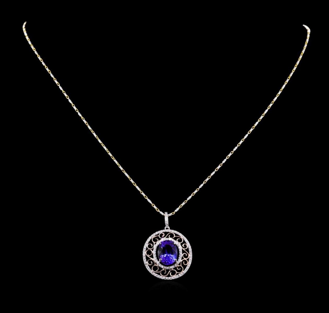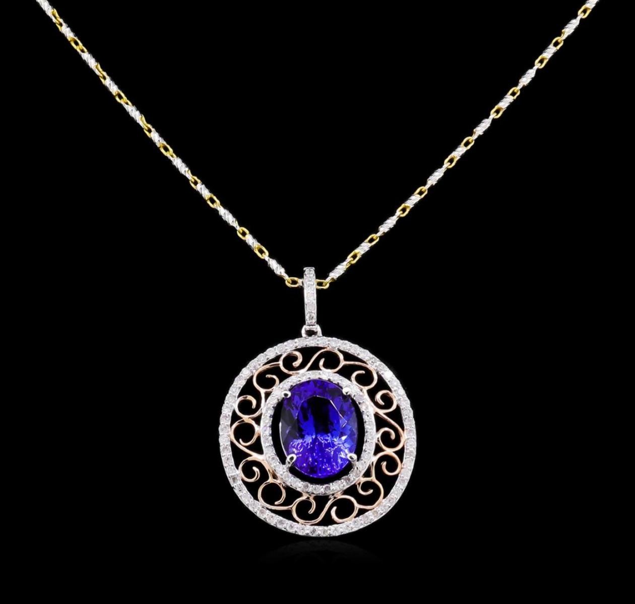 One electronically tested 14KT white and yellow gold Ladies combination cast & die struck pendant & chain 17.0" long, medium fancy cable link with a lobster claw clasp with a bright polish finish. Condition is new. Identified with markings of "14K". Containing: One prong set oval modified mixed cut natural tanzanite, measuring 11.50 x 8.60 x 6.10mm, approximate weight of 4.32ct., clarity is eye clean, type I, medium dark, moderately strong, blue color, (GIA B 6/4), cut is very good. Colored gemstones are presumed to have been subjected to commonly used and possible undetectable color/clarity enhancement processes. Ninety-Nine bead set round brilliant cut diamonds, measuring 1.10 - 1.10 x 0.66mm (depth est.) approximate. Total Weight of 99 Stones = 0.55ct. Clarity: I-2 to I-3. Color: H - I, Cut is Good. Total Weight of Colored Stones 4.32ct. Total Weight of Diamonds 0.55ct. Total Weight of Pendant & Chain 7.20gm. GGL Appraised.