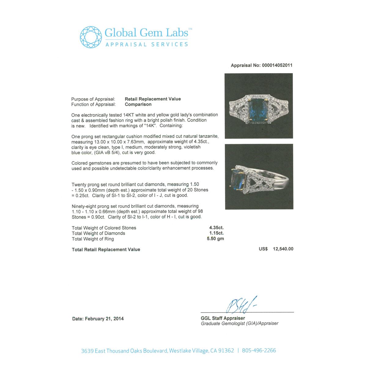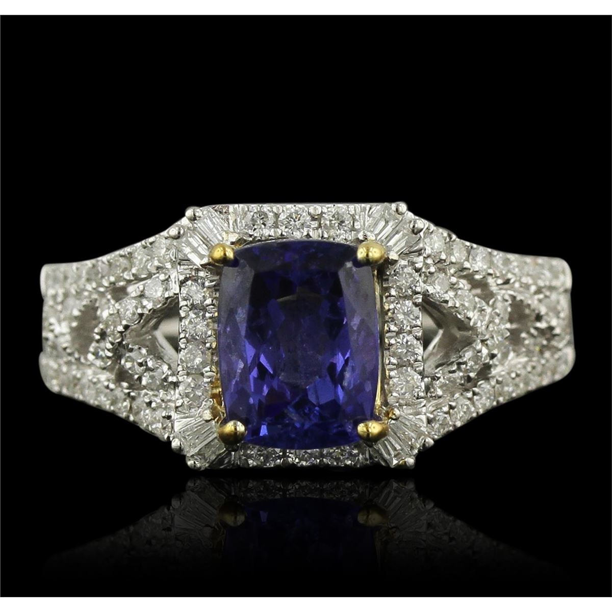 One electronically tested 14KT white and yellow gold Ladies combination cast & assembled fashion ring with a bright polish finish. Condition is new. Identified with markings of "14K". Containing: One prong set rectangular cushion modified mixed cut natural tanzanite, measuring 13.00 x 10.00 x 7.63mm, approximate weight of 4.35ct., clarity is eye clean, type I, medium, moderately strong, violetish blue color, (GIA vB 5/4), cut is very good. Colored gemstones are presumed to have been subjected to commonly used and possible undetectable color/clarity enhancement processes. Twenty prong set round brilliant cut diamonds, measuring 1.50 - 1.50 x 0.90mm (depth est.) approximate. Total Weight of 20 Stones = 0.25ct. Clarity: SI-1 to SI-2. Color: I - J, Cut is Good. Ninety-Eight prong set round brilliant cut diamonds, measuring 1.10 - 1.10 x 0.66mm (depth est.) approximate. Total Weight of 98 Stones = 0.90ct. Clarity: SI-2 to I-1. Color: H - I, Cut is Good. Total Weight of Colored Stones 4.35ct. Total Weight of Diamonds 1.15ct. Total Weight of Ring 5.50 grams. GGL Appraised at $12,540.00.