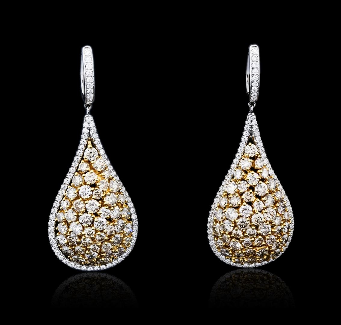 One pair electronically tested 14KT white and yellow gold ladies cast diamond earrings with hinged clip backs with a bright polish finish. Identified with markings of "14K". Condition is new. Containing: One Hundred Forty prong set round brilliant cut diamonds, measuring 1.10 - 1.10 x 0.66mm (depth est.) approximate total weight of 140 Stones = 0.67ct. Clarity: SI-2 to I-1. Color: I - J, Cut is Good. Eighty prong set round brilliant cut diamonds, measuring 2.90 - 1.80 x 1.41mm (depth est.) approximate total weight of 80 Stones = 3.80ct. Clarity: VS-2 to SI-1, Cut is Good. All diamonds are graded in the mounting, unless otherwise stated. Total Weight of Diamonds 4.47ct. Total Weight of Earrings 14.40 grams. GGL Appraised at $15,130.00.