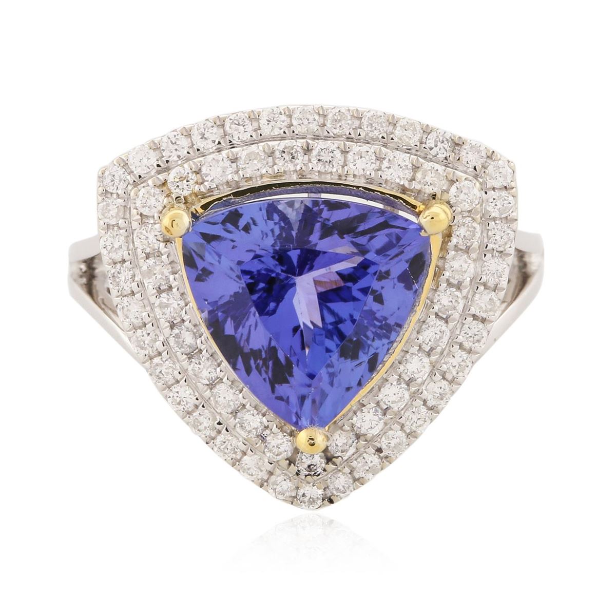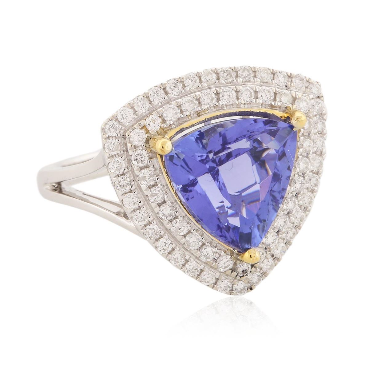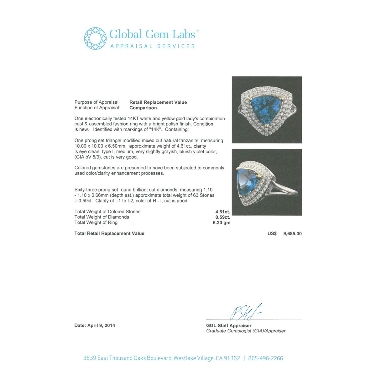 One electronically tested 14KT white and yellow gold Ladies combination cast & assembled fashion ring with a bright polish finish. Condition is new. Identified with markings of "14K". Containing: One prong set triangle modified mixed cut natural tanzanite, measuring 10.00 x 10.00 x 6.50mm, approximate weight of 4.61ct., clarity is eye clean, type I, medium, very slightly grayish, bluish violet color, (GIA bV 5/3), cut is very good. Colored gemstones are presumed to have been subjected to commonly used color/clarity enhancement processes. Sixty-Three prong set round brilliant cut diamonds, measuring 1.10 - 1.10 x 0.66mm (depth est.) approximate. Total Weight of 63 Stones = 0.59ct. Clarity: I-1 to I-2. Color: H - I, Cut is Good. Total Weight of Colored Stones 4.61ct. Total Weight of Diamonds 0.59ct. Total Weight of Ring 6.20 grams. GGL Appraised at $9,685.00.