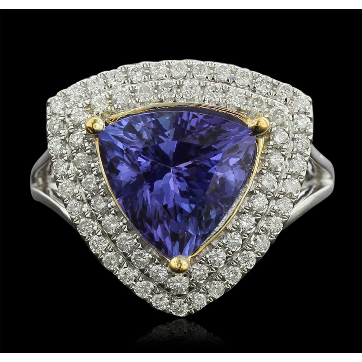One electronically tested 14KT white and yellow gold Ladies combination cast & assembled fashion ring with a bright polish finish. Condition is new. Identified with markings of "14K". Containing: One prong set triangle modified mixed cut natural tanzanite, measuring 10.00 x 10.00 x 6.50mm, approximate weight of 4.61ct., clarity is eye clean, type I, medium, very slightly grayish, bluish violet color, (GIA bV 5/3), cut is very good. Colored gemstones are presumed to have been subjected to commonly used color/clarity enhancement processes. Sixty-Three prong set round brilliant cut diamonds, measuring 1.10 - 1.10 x 0.66mm (depth est.) approximate. Total Weight of 63 Stones = 0.59ct. Clarity: I-1 to I-2. Color: H - I, Cut is Good. Total Weight of Colored Stones 4.61ct. Total Weight of Diamonds 0.59ct. Total Weight of Ring 6.20 grams. GGL Appraised at $9,685.00.