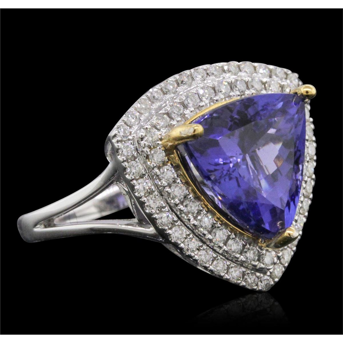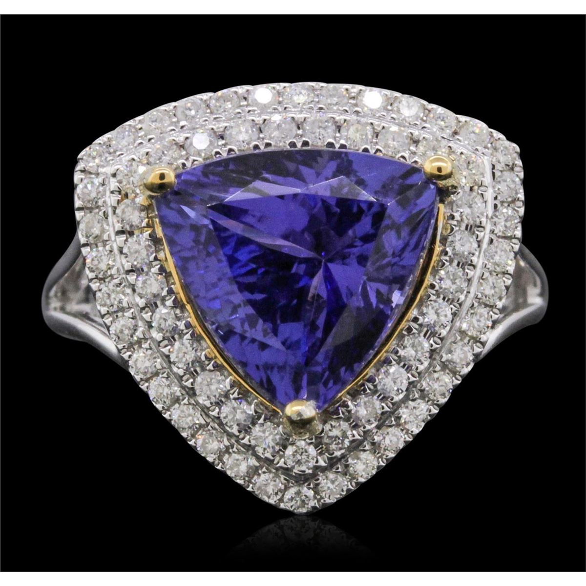 One electronically tested 14KT white and yellow gold ladies combination cast & assembled tanzanite and diamond ring with a flat shank with a bright polish finish. Identified with markings of "14K". Condition is new. Containing: One prong set triangle modified brilliant cut natural tanzanite, measuring 10.42 x 10.20 x 7.34mm, approximate weight of 4.70ct., clarity is eye clean, type I, medium, moderately strong, bluish violet color, (GIA bV 5/4), cut is good. Sixty-Three prong set round brilliant cut diamonds, measuring 1.20 - 1.20 x 0.72mm (depth est.) stated total weight of 63 Stones = 0.40ct. Clarity: SI-2 to I-1. Color: I - J, Cut is Good. Colored gemstones are presumed to have been subjected to commonly used enhancement processes. All diamonds and colored gemstones are graded in the mounting, unless otherwise stated total weight of Colored Stones 4.70ct. Total Weight of Diamonds 0.40ct. Total Weight of Ring 6.90 grams. GGL Appraised at $10,030.00.