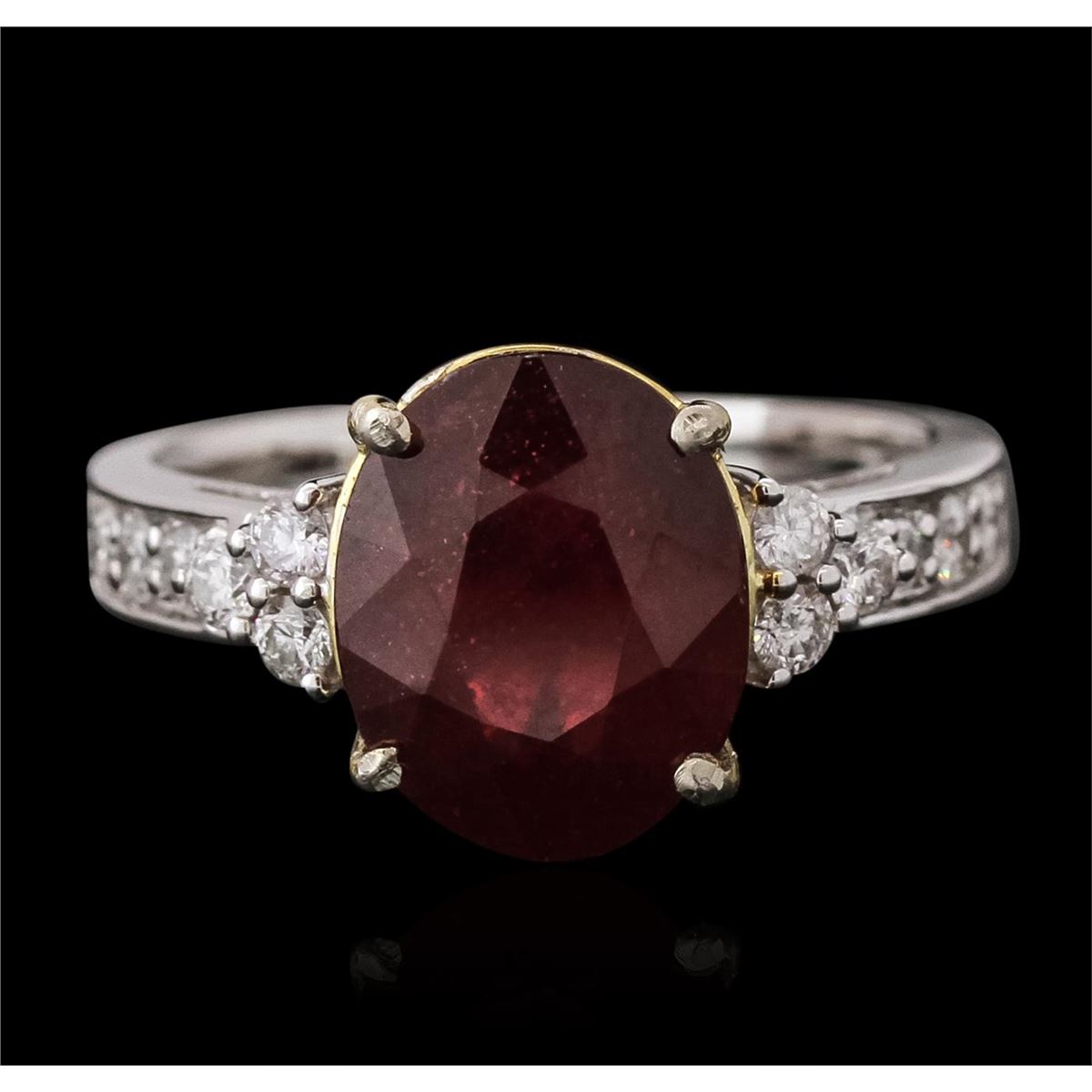 One electronically tested 14KT white and yellow gold ladies combination cast & assembled ruby and diamond ring with a flat shank with a bright polish finish. Identified with markings of "14K". Condition is new. Containing: One prong set oval modified brilliant cut natural ruby, measuring 11.32 x 9.17 x 5.69mm, approximate weight of 4.78ct., clarity is heavily included, type II, medium dark, moderately strong, strongly purplish red color, (GIA stpR 6/4), cut is good. Twelve prong set round brilliant cut diamonds, measuring 1.80 - 1.80 x 1.08mm (depth est.) approximate total weight of 12 Stones = 0.26ct. Clarity: SI-2 to I-1. Color: I - J, Cut is Good. Colored gemstones are presumed to have been subjected to commonly used enhancement processes. All diamonds and colored gemstones are graded in the mounting, unless otherwise stated. Total Weight of Colored Stones 4.78ct. Total Weight of Diamonds 0.26ct. Total Weight of Ring 5.40 grams. GGL Appraised at $4,375.00.