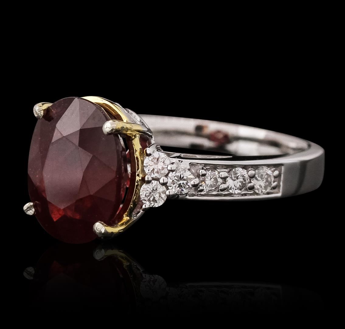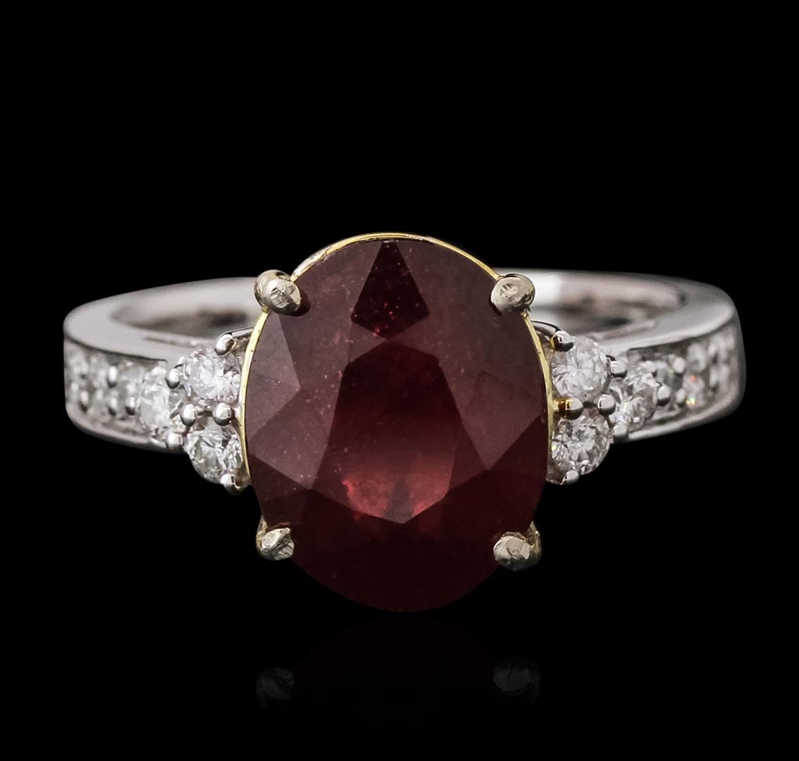 One electronically tested 14KT white and yellow gold ladies combination cast & assembled ruby and diamond ring with a flat shank with a bright polish finish. Identified with markings of "14K". Condition is new. Containing: One prong set oval modified brilliant cut natural ruby, measuring 11.32 x 9.17 x 5.69mm, approximate weight of 4.78ct., clarity is heavily included, type II, medium dark, moderately strong, strongly purplish red color, (GIA stpR 6/4), cut is good. Twelve prong set round brilliant cut diamonds, measuring 1.80 - 1.80 x 1.08mm (depth est.) approximate total weight of 12 Stones = 0.26ct. Clarity: SI-2 to I-1. Color: I - J, Cut is Good. Colored gemstones are presumed to have been subjected to commonly used enhancement processes. All diamonds and colored gemstones are graded in the mounting, unless otherwise stated. Total Weight of Colored Stones 4.78ct. Total Weight of Diamonds 0.26ct. Total Weight of Ring 5.40 grams. GGL Appraised at $4,375.00.