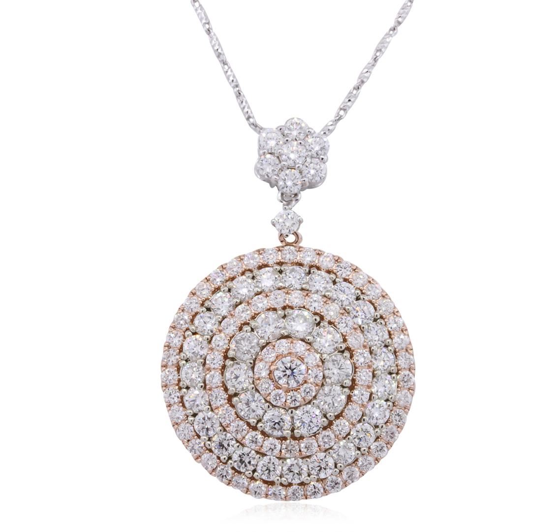 One electronically tested 14KT rose and white gold ladies cast & assembled diamond pendant with chain. The pendant features multiple tiered diamond bezels, completed by a diamond floret bail. The pendant is supported by an eighteen inch length 14KT white gold designer style chain, terminating in a lobster claw clasp. Bright polish finish. Condition is new, good workmanship. Containing: Forty-One prong set round brilliant cut diamonds, measuring 2.95 - 2.70 x 1.70mm (depth est.) approximate total weight of 41 Stones = 3.49ct. Graded in the setting. Clarity: SI-1 to I-1. Color: G - I Seventy-Four prong set round brilliant cut diamonds, measuring 1.70 - 1.60 x 0.99mm (depth est.) approximate total weight of 74 Stones = 1.31ct. Graded in the setting. Clarity: SI-1 to I-1. Color: G - I. Total Weight of Diamonds 4.80ct. Total Weight of Pendant With Chain 14.45 grams. AIG Appraised at $16,445.00.