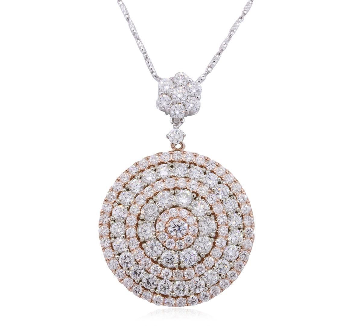One electronically tested 14KT rose and white gold ladies cast & assembled diamond pendant with chain. The pendant features multiple tiered diamond bezels, completed by a diamond floret bail. The pendant is supported by an eighteen inch length 14KT white gold designer style chain, terminating in a lobster claw clasp. Bright polish finish. Condition is new, good workmanship. Containing: Forty-One prong set round brilliant cut diamonds, measuring 2.95 - 2.70 x 1.70mm (depth est.) approximate total weight of 41 Stones = 3.49ct. Graded in the setting. Clarity: SI-1 to I-1. Color: G - I Seventy-Four prong set round brilliant cut diamonds, measuring 1.70 - 1.60 x 0.99mm (depth est.) approximate total weight of 74 Stones = 1.31ct. Graded in the setting. Clarity: SI-1 to I-1. Color: G - I. Total Weight of Diamonds 4.80 ct. Total Weight of Pendant With Chain 14.45 grams. AIG Appraised.