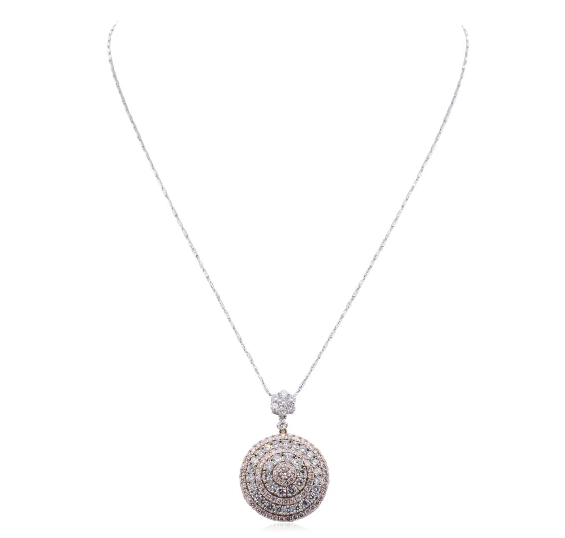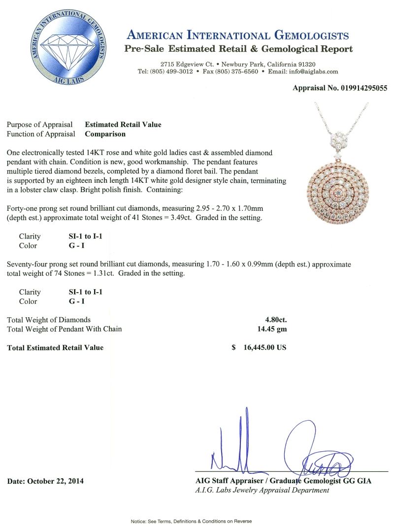One electronically tested 14KT rose and white gold ladies cast & assembled diamond pendant with chain. The pendant features multiple tiered diamond bezels, completed by a diamond floret bail. The pendant is supported by an eighteen inch length 14KT white gold designer style chain, terminating in a lobster claw clasp. Bright polish finish. Condition is new, good workmanship. Containing: Forty-One prong set round brilliant cut diamonds, measuring 2.95 - 2.70 x 1.70mm (depth est.) approximate total weight of 41 Stones = 3.49ct. Graded in the setting. Clarity: SI-1 to I-1. Color: G - I Seventy-Four prong set round brilliant cut diamonds, measuring 1.70 - 1.60 x 0.99mm (depth est.) approximate total weight of 74 Stones = 1.31ct. Graded in the setting. Clarity: SI-1 to I-1. Color: G - I. Total Weight of Diamonds 4.80ct. Total Weight of Pendant With Chain 14.45 grams. AIG Appraised at $16,445.00.