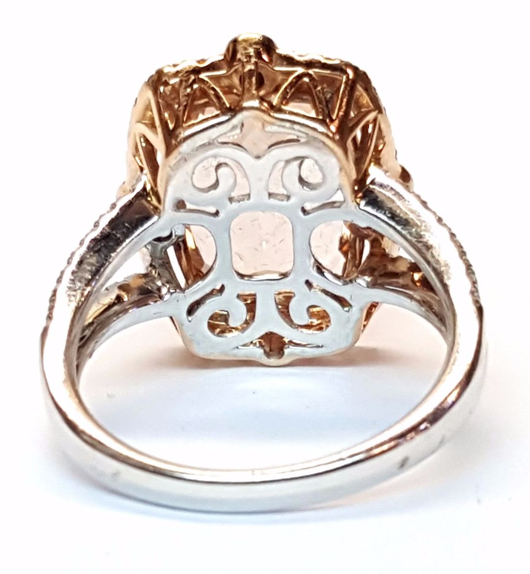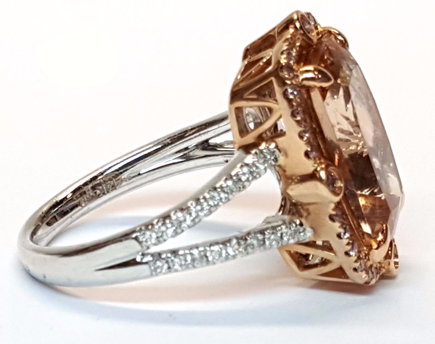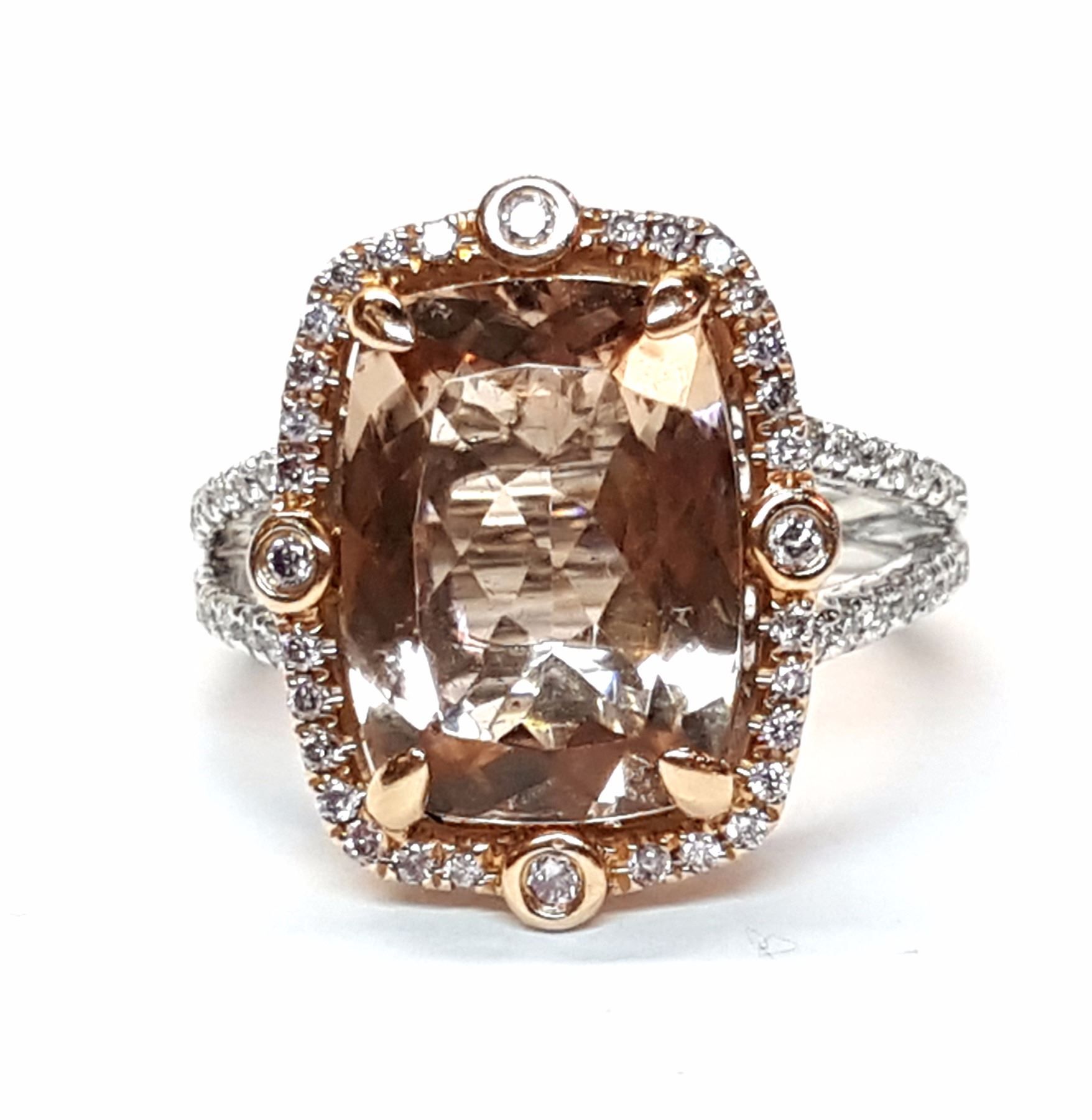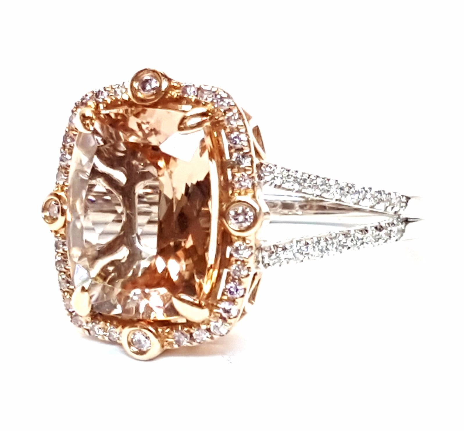 (1) Morganite stone with a total weight of 5.00cts. Diamonds with a total weight of 0.35cts. Total weight of this ring is 6.4 grams.