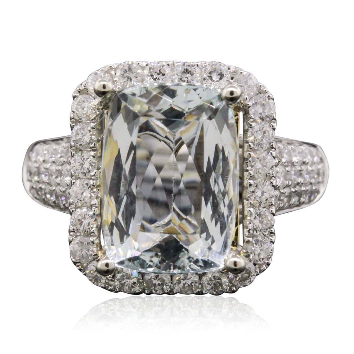 One electronically tested 14KT white and yellow gold Ladies combination cast & assembled fancy ring with a high polish finish. Condition is new. Identified with markings of "14K". Containing: One prong set oval rectangular cushion modified mixed cut natural aquamarine, measuring 13.00 x 9.00 x 5.90mm, approximate weight of 5.06ct., clarity is eye clean, type I, very light, slightly grayish, blue color, (GIA B 2/2), cut is very good. Colored gemstones are presumed to have been subjected to commonly used color/clarity enhancement processes. Sixty bead set round brilliant cut diamonds, measuring 1.70 - 1.60 x 0.99mm (depth est.) approximate. Total Weight of 60 Stones = 1.33ct. Clarity: I-1 to I-2. Color: G - H, Cut is Good. Total Weight of Colored Stones 5.06ct. Total Weight of Diamonds 1.33ct. Total Weight of Ring 6.40 grams. GGL Appraised at $6,955.00.