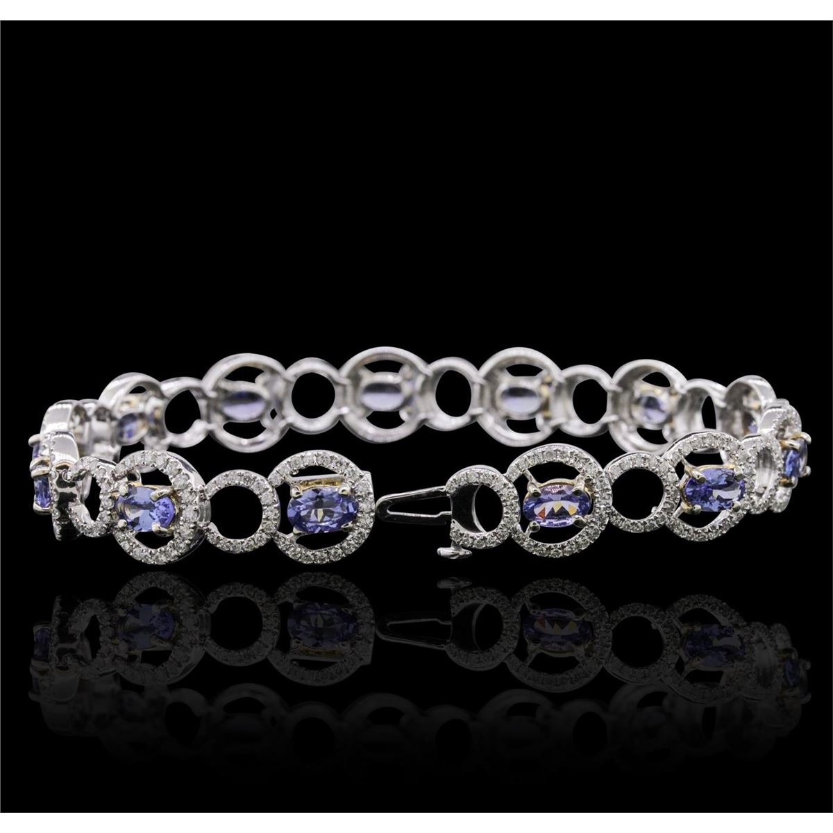 One electronically tested 14KT white and yellow gold ladies combination cast & assembled tanzanite and diamond bracelet with a hidden box clasp with a bright polish finish. Measurements: 7.25" in length. Condition is new. Containing: Thirteen prong set oval modified brilliant cut natural tanzanites, measuring 6.13 x 3.86 x 2.36mm, approximate total weight of 5.07ct., clarity is eye clean, type I, medium light, very slightly grayish, violet color, (GIA V 4/3), cut is very good. Five Hundred Twenty prong set round brilliant cut diamonds, measuring 1.00 - 1.00 x 0.60mm (depth est.) approximate total weight of 520 Stones = 1.87ct. Clarity: I-1 to I-2. Color: I - J, Cut is Good. Colored gemstones are presumed to have been subjected to commonly used enhancement processes. All diamonds and colored gemstones are graded in the mounting, unless otherwise stated. Total Weight of Colored Stones 5.07ct. Total Weight of Diamonds 1.87ct. Total Weight of Bracelet 15.60 grams. GGL Appraised at $12,580.00.