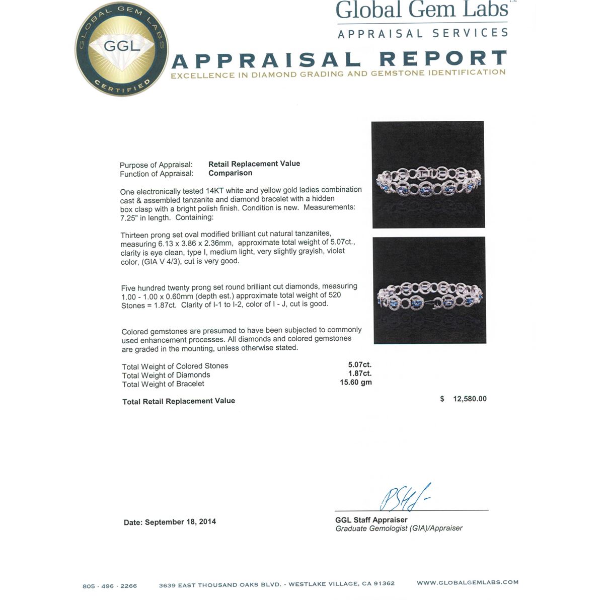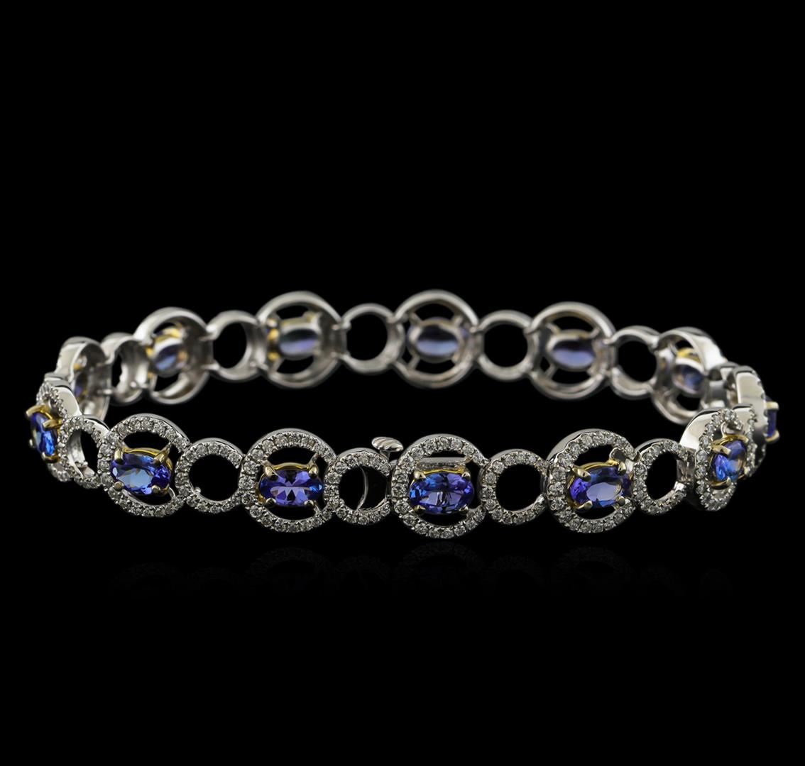 One electronically tested 14KT white and yellow gold ladies combination cast & assembled tanzanite and diamond bracelet with a hidden box clasp with a bright polish finish. Measurements: 7.25" in length. Condition is new. Containing: Thirteen prong set oval modified brilliant cut natural tanzanites, measuring 6.13 x 3.86 x 2.36mm, approximate total weight of 5.07ct., clarity is eye clean, type I, medium light, very slightly grayish, violet color, (GIA V 4/3), cut is very good. Five Hundred Twenty prong set round brilliant cut diamonds, measuring 1.00 - 1.00 x 0.60mm (depth est.) approximate total weight of 520 Stones = 1.87ct. Clarity: I-1 to I-2. Color: I - J, Cut is Good. Colored gemstones are presumed to have been subjected to commonly used enhancement processes. All diamonds and colored gemstones are graded in the mounting, unless otherwise stated. Total Weight of Colored Stones 5.07ct. Total Weight of Diamonds 1.87ct. Total Weight of Bracelet 15.60 grams. GGL Appraised at $12,580.00.
