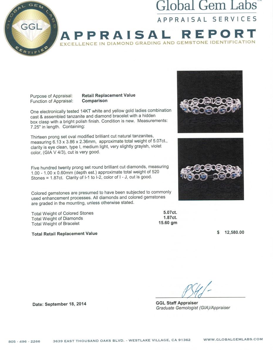 One electronically tested 14KT white and yellow gold ladies combination cast & assembled tanzanite and diamond bracelet with a hidden box clasp with a bright polish finish. Measurements: 7.25" in length. Condition is new. Containing: Thirteen prong set oval modified brilliant cut natural tanzanites, measuring 6.13 x 3.86 x 2.36mm, approximate total weight of 5.07ct., clarity is eye clean, type I, medium light, very slightly grayish, violet color, (GIA V 4/3), cut is very good. Five Hundred Twenty prong set round brilliant cut diamonds, measuring 1.00 - 1.00 x 0.60mm (depth est.) approximate total weight of 520 Stones = 1.87ct. Clarity: I-1 to I-2. Color: I - J, Cut is Good. Colored gemstones are presumed to have been subjected to commonly used enhancement processes. All diamonds and colored gemstones are graded in the mounting, unless otherwise stated. Total Weight of Colored Stones 5.07ct. Total Weight of Diamonds 1.87ct. Total Weight of Bracelet 15.60 grams. GGL Appraised at $12,580.00.