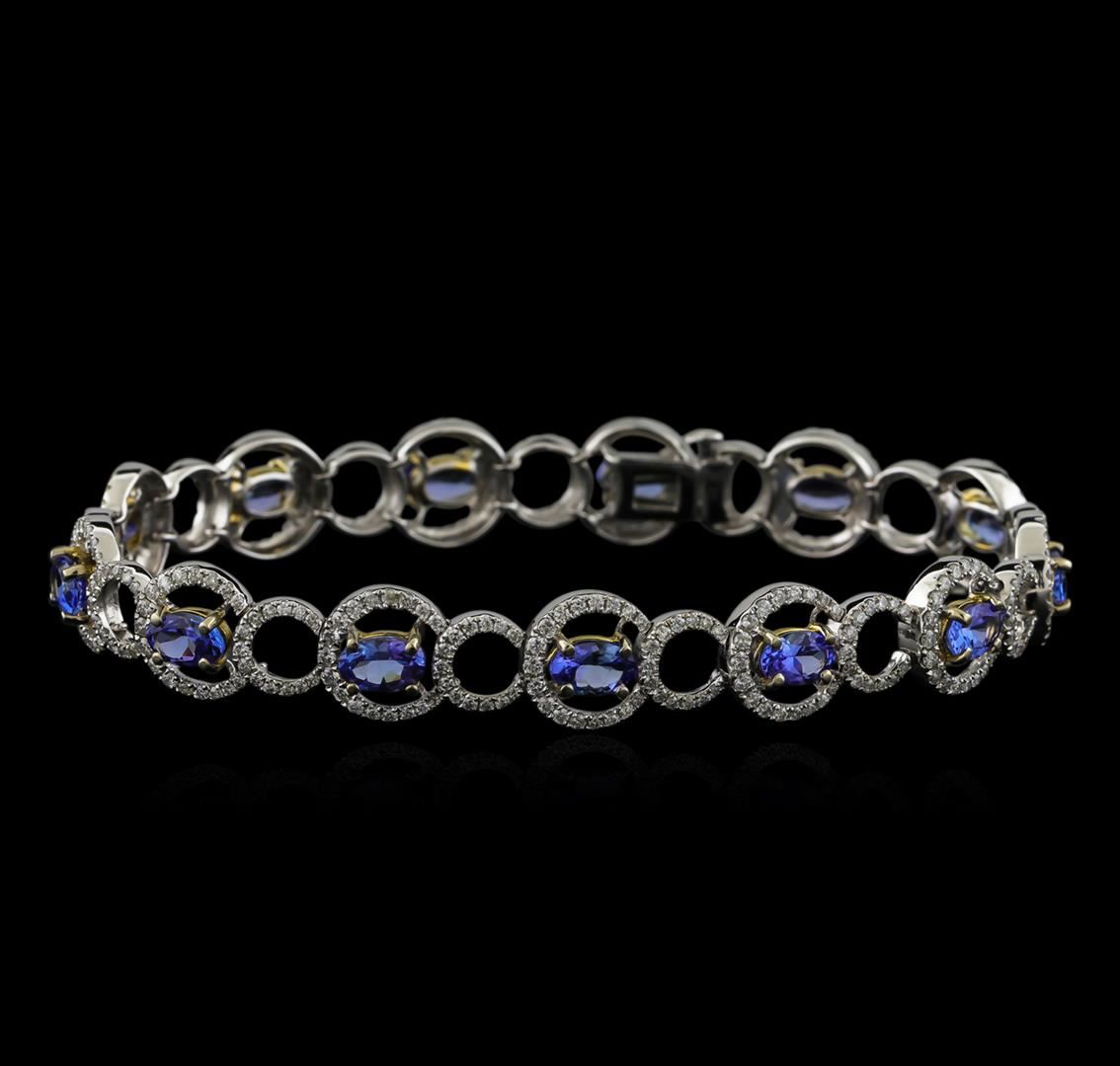 One electronically tested 14KT white and yellow gold ladies combination cast & assembled tanzanite and diamond bracelet with a hidden box clasp with a bright polish finish. Measurements: 7.25" in length. Condition is new. Containing: Thirteen prong set oval modified brilliant cut natural tanzanites, measuring 6.13 x 3.86 x 2.36mm, approximate total weight of 5.07ct., clarity is eye clean, type I, medium light, very slightly grayish, violet color, (GIA V 4/3), cut is very good. Five Hundred Twenty prong set round brilliant cut diamonds, measuring 1.00 - 1.00 x 0.60mm (depth est.) approximate total weight of 520 Stones = 1.87ct. Clarity: I-1 to I-2. Color: I - J, Cut is Good. Colored gemstones are presumed to have been subjected to commonly used enhancement processes. All diamonds and colored gemstones are graded in the mounting, unless otherwise stated. Total Weight of Colored Stones 5.07ct. Total Weight of Diamonds 1.87ct. Total Weight of Bracelet 15.60 grams. GGL Appraised at $12,580.00.