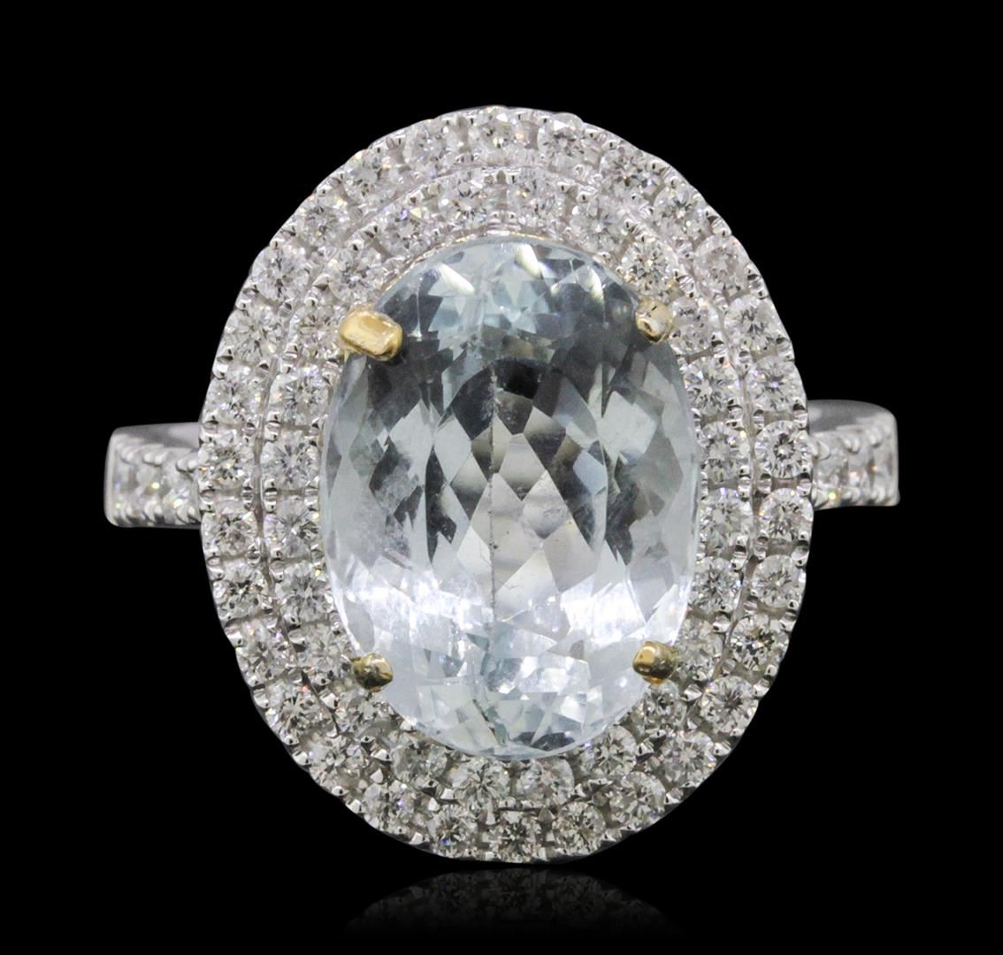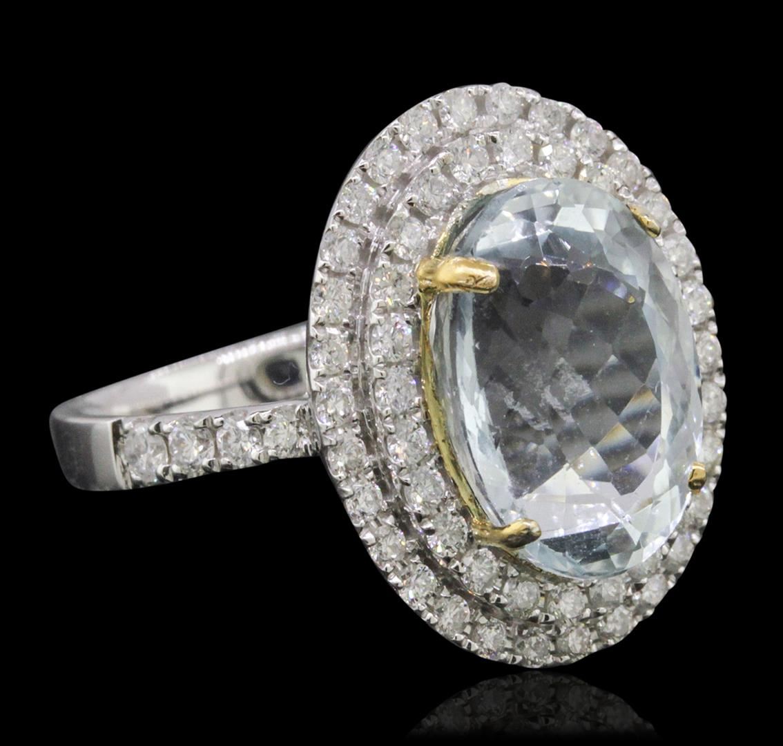 One electronically tested 14KT white and yellow gold ladies combination cast & assembled aquamarine and diamond ring with a flat shank with a bright polish finish. Identified with markings of "14K". Condition is new. Containing: One prong set oval modified brilliant cut natural aquamarine, measuring 13.39 x 9.70 x 7.07mm, approximate weight of 5.13ct., clarity is eye clean, type I, light, very slightly grayish, blue color, (GIA B 3/3), cut is very good. Sixty-Two prong set round brilliant cut diamonds, measuring 2.00 - 1.30 x 0.99mm (depth est.) approximate total weight of 62 Stones = 0.75ct. Clarity: SI-2 to I-1. Color: I - J, Cut is Good. Colored gemstones are presumed to have been subjected to commonly used enhancement processes. All diamonds and colored gemstones are graded in the mounting, unless otherwise stated. Total Weight of Colored Stones 5.13ct. Total Weight of Diamonds 0.75ct. Total Weight of Ring 6.90 grams. GGL Appraised at $7,300.00.