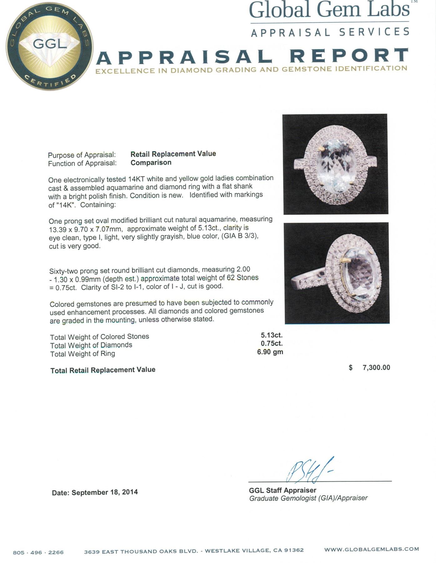One electronically tested 14KT white and yellow gold ladies combination cast & assembled aquamarine and diamond ring with a flat shank with a bright polish finish. Identified with markings of "14K". Condition is new. Containing: One prong set oval modified brilliant cut natural aquamarine, measuring 13.39 x 9.70 x 7.07mm, approximate weight of 5.13ct., clarity is eye clean, type I, light, very slightly grayish, blue color, (GIA B 3/3), cut is very good. Sixty-Two prong set round brilliant cut diamonds, measuring 2.00 - 1.30 x 0.99mm (depth est.) approximate total weight of 62 Stones = 0.75ct. Clarity: SI-2 to I-1. Color: I - J, Cut is Good. Colored gemstones are presumed to have been subjected to commonly used enhancement processes. All diamonds and colored gemstones are graded in the mounting, unless otherwise stated. Total Weight of Colored Stones 5.13ct. Total Weight of Diamonds 0.75ct. Total Weight of Ring 6.90 grams. GGL Appraised.