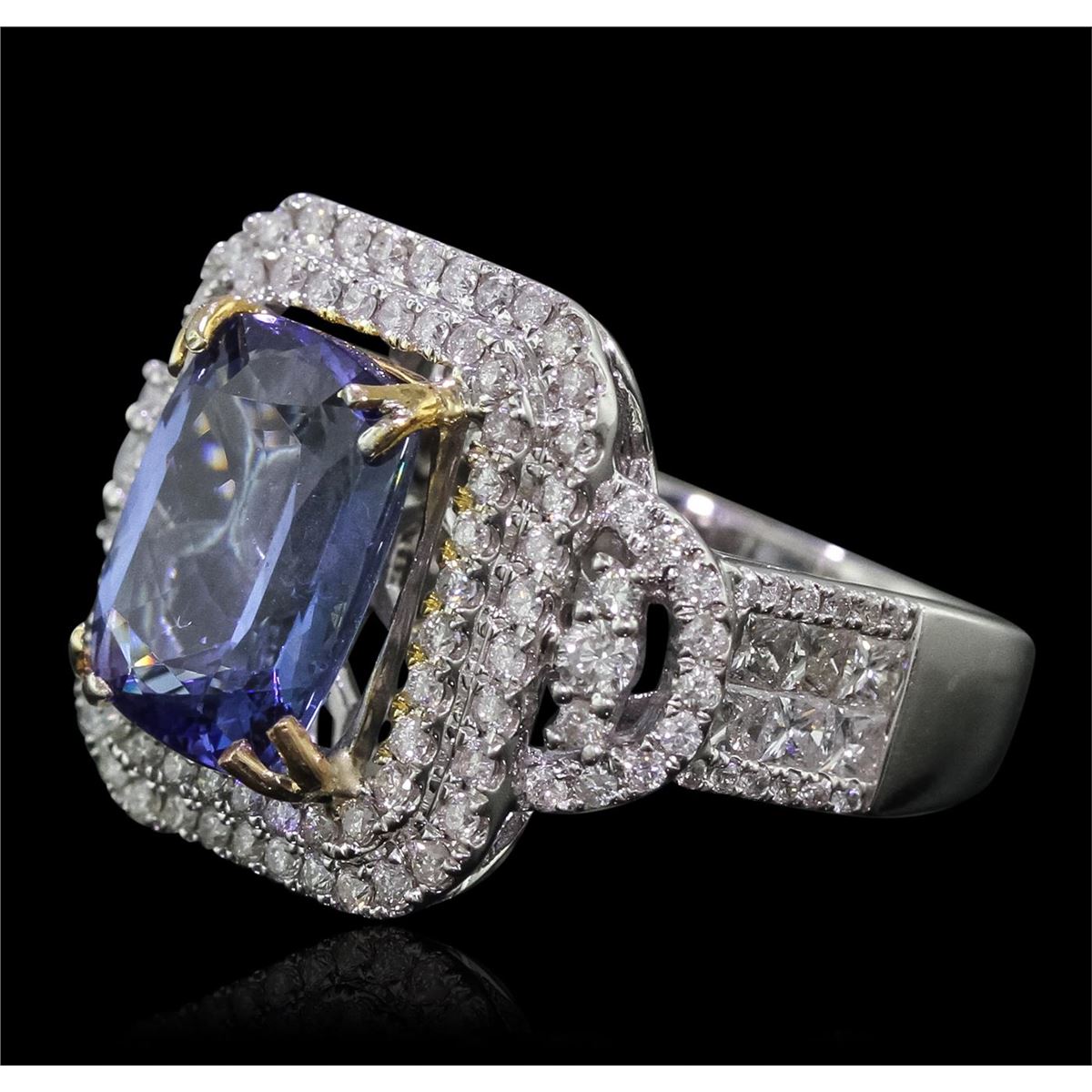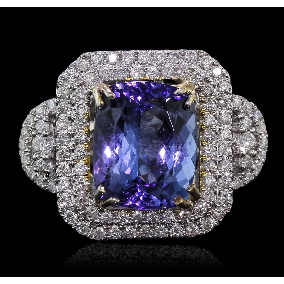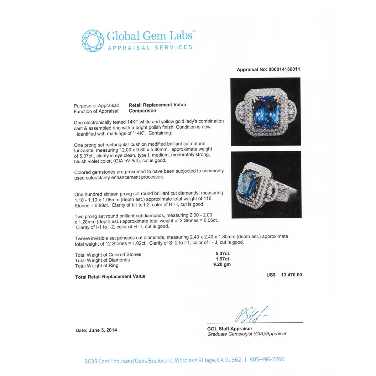 One electronically tested 14KT white and yellow gold Ladies combination cast & assembled ring with a bright polish finish. Condition is new. Identified with markings of "14K". Containing: One prong set rectangular cushion modified brilliant cut natural tanzanite, measuring 12.00 x 9.80 x 5.80mm, approximate weight of 5.37ct., clarity is eye clean, type I, medium, moderately strong, bluish violet color, (GIA bV 5/4), cut is good. Colored gemstones are presumed to have been subjected to commonly used color/clarity enhancement processes. One Hundred Sixteen prong set round brilliant cut diamonds, measuring 1.10 - 1.10 x 1.05mm (depth est.) approximate. Total Weight of 116 Stones = 0.89ct. Clarity: I-1 to I-2. Color: H - I, Cut is Good. Two prong set round brilliant cut diamonds, measuring 2.00 - 2.00 x 1.20mm (depth est.) approximate. Total Weight of 2 Stones = 0.06ct. Clarity: I-1 to I-2. Color: H - I, Cut is Good. Twelve invisible set princess cut diamonds, measuring 2.40 x 2.40 x 1.80mm (depth est.) approximate. Total Weight of 12 Stones = 1.02ct. Clarity: SI-2 to I-1. Color: I - J, Cut is Good. Total Weight of Colored Stones 5.37ct. Total Weight of Diamonds 1.97ct. Total Weight of Ring 9.20 grams. GGL Appraised at $13,470.00.