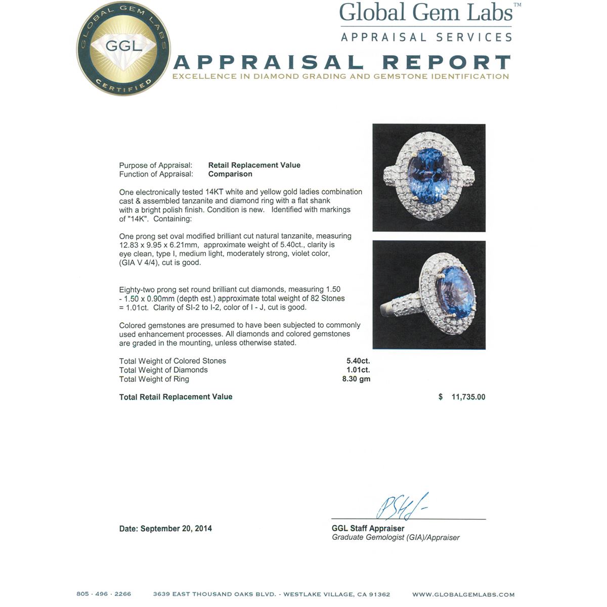 One electronically tested 14KT white and yellow gold ladies combination cast & assembled tanzanite and diamond ring with a flat shank with a bright polish finish. Identified with markings of "14K". Condition is new. Containing: One prong set oval modified brilliant cut natural tanzanite, measuring 12.83 x 9.95 x 6.21mm, approximate weight of 5.40ct., clarity is eye clean, type I, medium light, moderately strong, violet color, (GIA V 4/4), cut is good. Eighty-Two prong set round brilliant cut diamonds, measuring 1.50 - 1.50 x 0.90mm (depth est.) approximate total weight of 82 Stones = 1.01ct. Clarity: SI-2 to I-2. Color: I - J, Cut is Good. Colored gemstones are presumed to have been subjected to commonly used enhancement processes. All diamonds and colored gemstones are graded in the mounting, unless otherwise stated. Total Weight of Colored Stones 5.40ct. Total Weight of Diamonds 1.01ct. Total Weight of Ring 8.30 grams. GGL Appraised at $11,735.00.