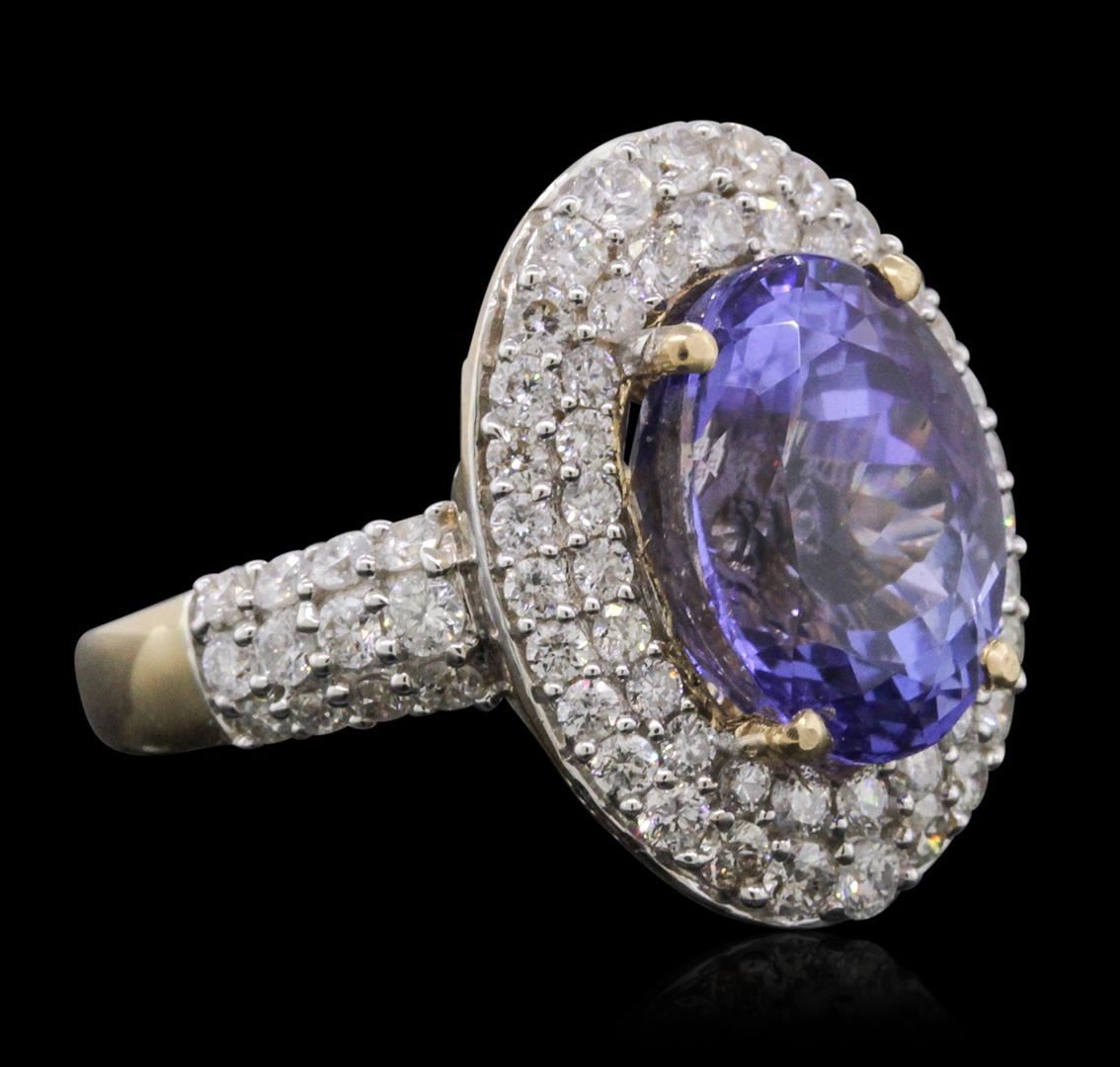 One electronically tested 14KT white and yellow gold ladies combination cast & assembled tanzanite and diamond ring with a flat shank with a bright polish finish. Identified with markings of "14K". Condition is new. Containing: One prong set oval modified brilliant cut natural tanzanite, measuring 12.83 x 9.95 x 6.21mm, approximate weight of 5.40ct., clarity is eye clean, type I, medium light, moderately strong, violet color, (GIA V 4/4), cut is good. Eighty-Two prong set round brilliant cut diamonds, measuring 1.50 - 1.50 x 0.90mm (depth est.) approximate total weight of 82 Stones = 1.01ct. Clarity: SI-2 to I-2. Color: I - J, Cut is Good. Colored gemstones are presumed to have been subjected to commonly used enhancement processes. All diamonds and colored gemstones are graded in the mounting, unless otherwise stated. Total Weight of Colored Stones 5.40ct. Total Weight of Diamonds 1.01ct. Total Weight of Ring 8.30 grams. GGL Appraised at $11,735.00.