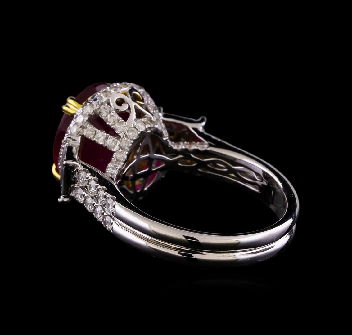 One electronically tested 14KT white and yellow gold ladies combination cast & assembled ruby and diamond ring with a split shank with a bright polish finish. Identified with markings of "14K". Condition is new. Containing: One prong set oval modified brilliant cut natural ruby, measuring 11.90 x 9.60 x 5.95mm, approximate weight of 5.44ct., clarity is heavily included, medium, moderately strong, purple red color, (GIA PR 5/4), cut is good. One Hundred Twenty-Nine prong set round brilliant cut diamonds, measuring 1.50 - 1.10 x 0.78mm (depth est.) approximate total weight of 129 Stones = 1.03ct. Clarity: SI-2 to I-2. Color: I - J, Cut is Good. Twelve channel set baguette cut diamonds, measuring 1.50 x 1.30 x 1.11mm (depth est.) approximate total weight of 12 Stones = 0.24ct. Clarity: SI-1. Color: J, Cut is Good. Colored gemstones are presumed to have been subjected to commonly used enhancement processes. All diamonds and colored gemstones are graded in the mounting, unless otherwise stated. Total Weight of Colored Stones 5.44ct. Total Weight of Diamonds 1.27ct. Total Weight of Ring 7.80 grams. GGL Appraised at $6,875.00.