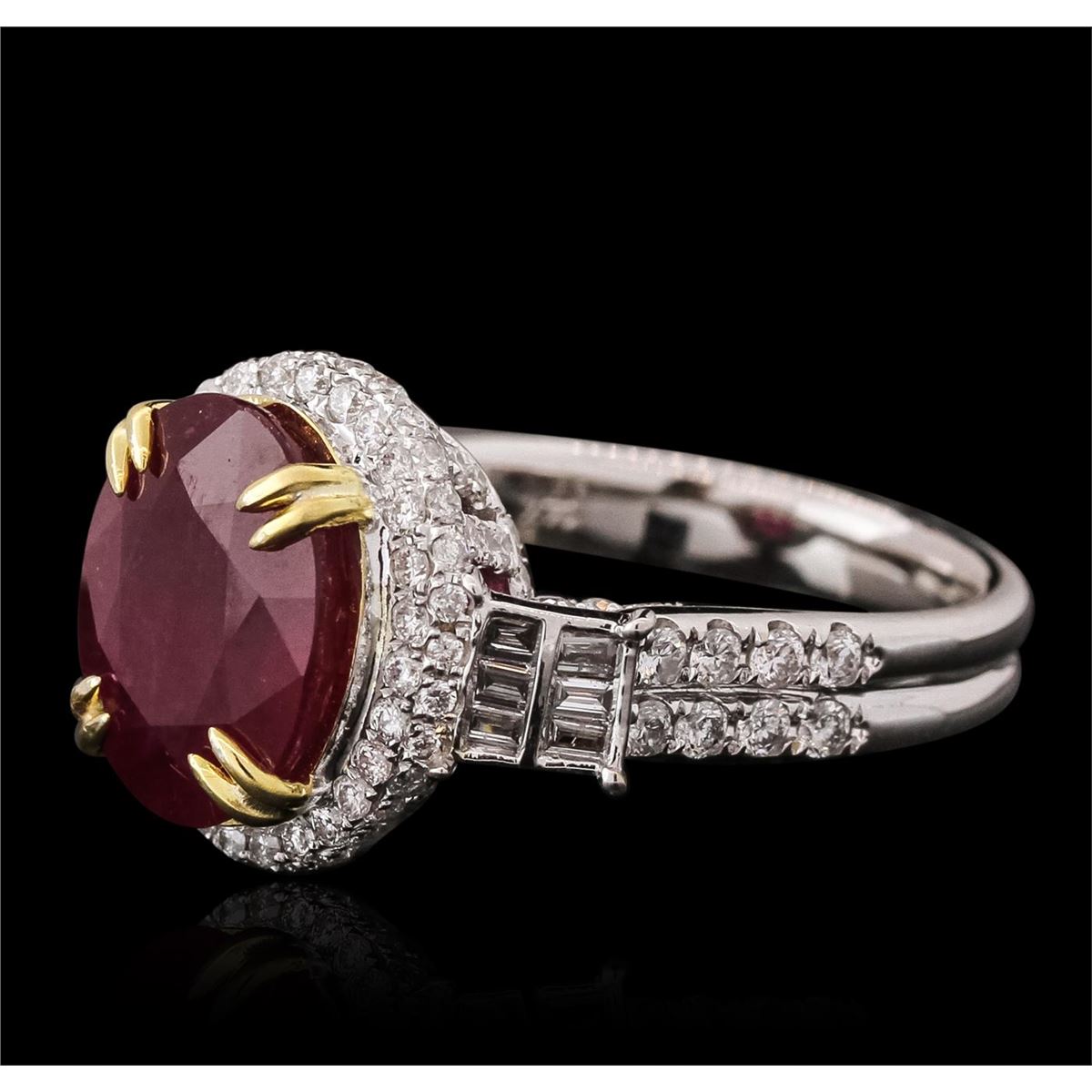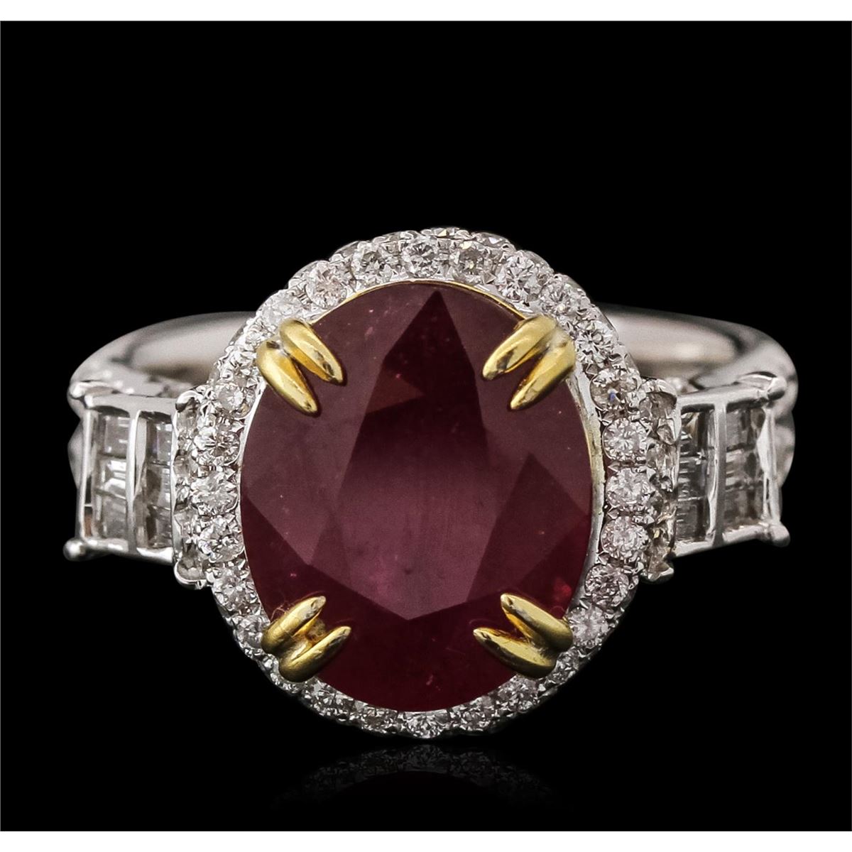 One electronically tested 14KT white and yellow gold ladies combination cast & assembled ruby and diamond ring with a split shank with a bright polish finish. Identified with markings of "14K". Condition is new. Containing: One prong set oval modified brilliant cut natural ruby, measuring 11.90 x 9.60 x 5.95mm, approximate weight of 5.44ct., clarity is heavily included, medium, moderately strong, purple red color, (GIA PR 5/4), cut is good. One Hundred Twenty-Nine prong set round brilliant cut diamonds, measuring 1.50 - 1.10 x 0.78mm (depth est.) approximate total weight of 129 Stones = 1.03ct. Clarity: SI-2 to I-2. Color: I - J, Cut is Good. Twelve channel set baguette cut diamonds, measuring 1.50 x 1.30 x 1.11mm (depth est.) approximate total weight of 12 Stones = 0.24ct. Clarity: SI-1. Color: J, Cut is Good. Colored gemstones are presumed to have been subjected to commonly used enhancement processes. All diamonds and colored gemstones are graded in the mounting, unless otherwise stated. Total Weight of Colored Stones 5.44ct. Total Weight of Diamonds 1.27ct. Total Weight of Ring 7.80 grams. GGL Appraised at $6,875.00.