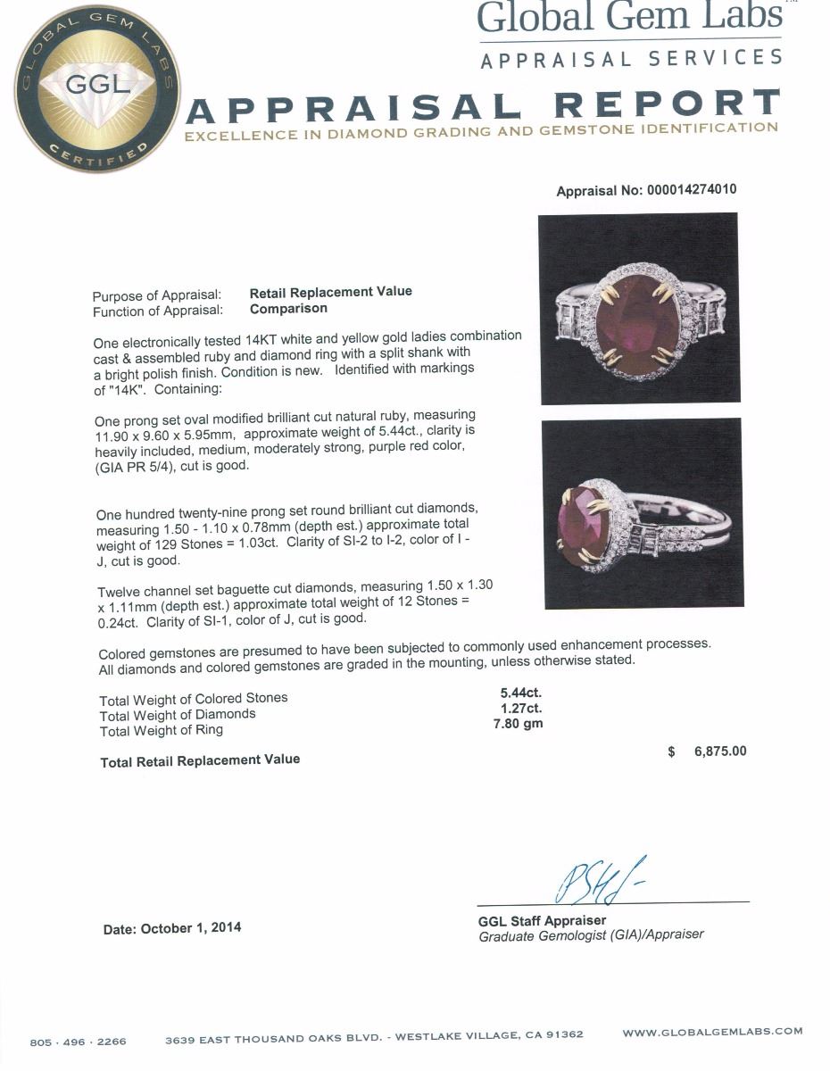 One electronically tested 14KT white and yellow gold ladies combination cast & assembled ruby and diamond ring with a split shank with a bright polish finish. Identified with markings of "14K". Condition is new. Containing: One prong set oval modified brilliant cut natural ruby, measuring 11.90 x 9.60 x 5.95mm, approximate weight of 5.44ct., clarity is heavily included, medium, moderately strong, purple red color, (GIA PR 5/4), cut is good. One Hundred Twenty-Nine prong set round brilliant cut diamonds, measuring 1.50 - 1.10 x 0.78mm (depth est.) approximate total weight of 129 Stones = 1.03ct. Clarity: SI-2 to I-2. Color: I - J, Cut is Good. Twelve channel set baguette cut diamonds, measuring 1.50 x 1.30 x 1.11mm (depth est.) approximate total weight of 12 Stones = 0.24ct. Clarity: SI-1. Color: J, Cut is Good. Colored gemstones are presumed to have been subjected to commonly used enhancement processes. All diamonds and colored gemstones are graded in the mounting, unless otherwise stated. Total Weight of Colored Stones 5.44ct. Total Weight of Diamonds 1.27ct. Total Weight of Ring 7.80 grams. GGL Appraised at $6,875.00.