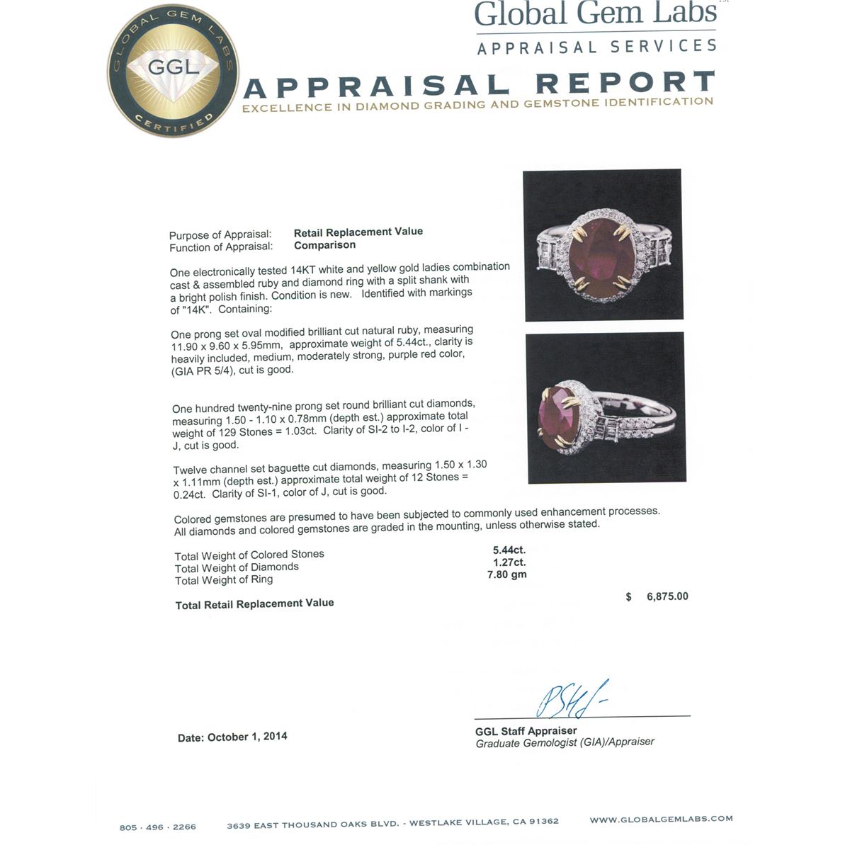 One electronically tested 14KT white and yellow gold ladies combination cast & assembled ruby and diamond ring with a split shank with a bright polish finish. Identified with markings of "14K". Condition is new. Containing: One prong set oval modified brilliant cut natural ruby, measuring 11.90 x 9.60 x 5.95mm, approximate weight of 5.44ct., clarity is heavily included, medium, moderately strong, purple red color, (GIA PR 5/4), cut is good. One Hundred Twenty-Nine prong set round brilliant cut diamonds, measuring 1.50 - 1.10 x 0.78mm (depth est.) approximate total weight of 129 Stones = 1.03ct. Clarity: SI-2 to I-2. Color: I - J, Cut is Good. Twelve channel set baguette cut diamonds, measuring 1.50 x 1.30 x 1.11mm (depth est.) approximate total weight of 12 Stones = 0.24ct. Clarity: SI-1. Color: J, Cut is Good. Colored gemstones are presumed to have been subjected to commonly used enhancement processes. All diamonds and colored gemstones are graded in the mounting, unless otherwise stated. Total Weight of Colored Stones 5.44ct. Total Weight of Diamonds 1.27ct. Total Weight of Ring 7.80 grams. GGL Appraised at $6,875.00.