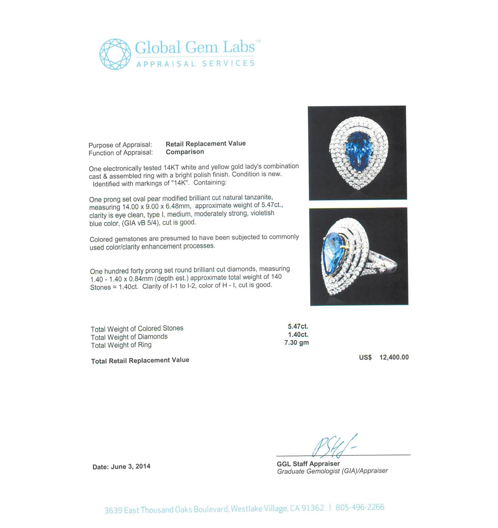 One electronically tested 14KT white and yellow gold Ladies combination cast & assembled ring with a bright polish finish. Condition is new. Identified with markings of "14K". Containing: One prong set oval pear modified brilliant cut natural tanzanite, measuring 14.00 x 9.00 x 6.48mm, approximate weight of 5.47ct., clarity is eye clean, type I, medium, moderately strong, violetish blue color, (GIA vB 5/4), cut is good. Colored gemstones are presumed to have been subjected to commonly used color/clarity enhancement processes. One Hundred Forty prong set round brilliant cut diamonds, measuring 1.40 - 1.40 x 0.84mm (depth est.) approximate. Total Weight of 140 Stones = 1.40ct. Clarity: I-1 to I-2. Color: H - I, Cut is Good. Total Weight of Colored Stones 5.47ct. Total Weight of Diamonds 1.40ct. Total Weight of Ring 7.30 grams. GGL Appraised at $12,400.00.