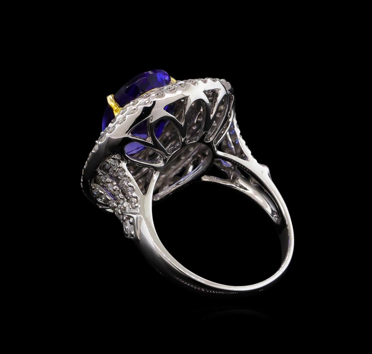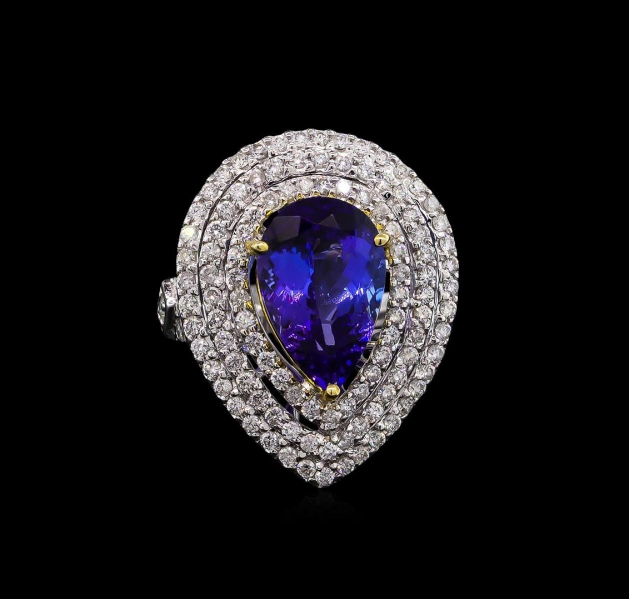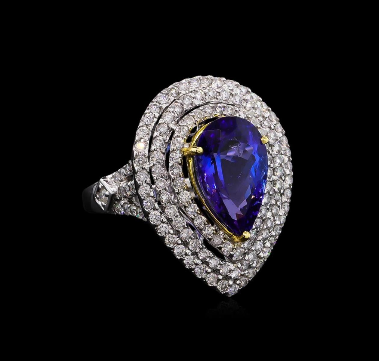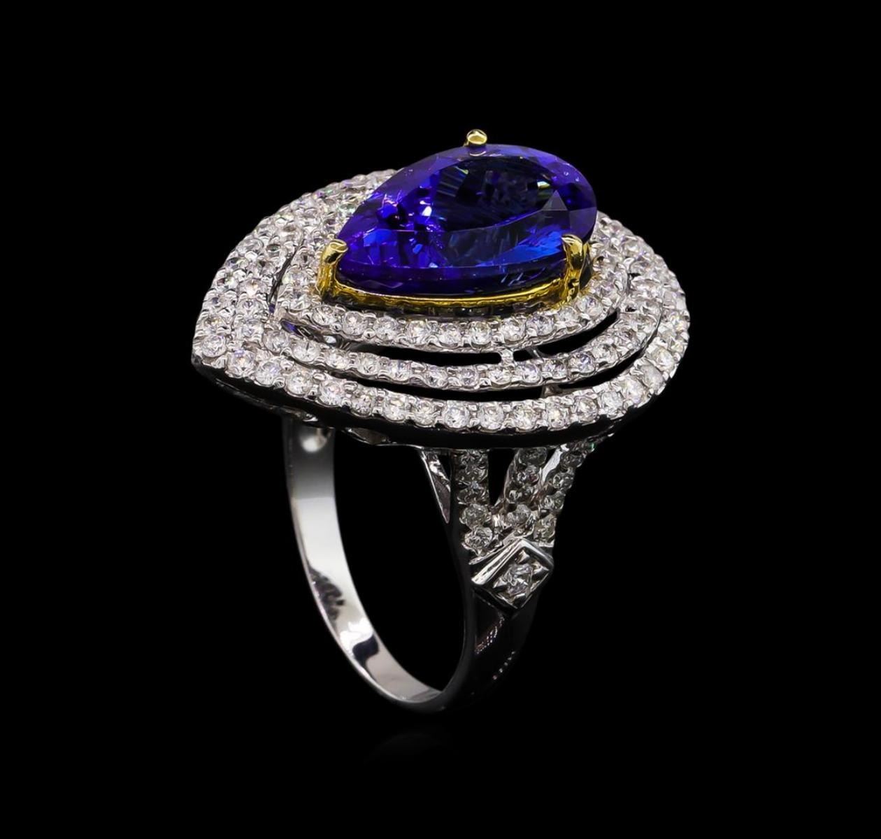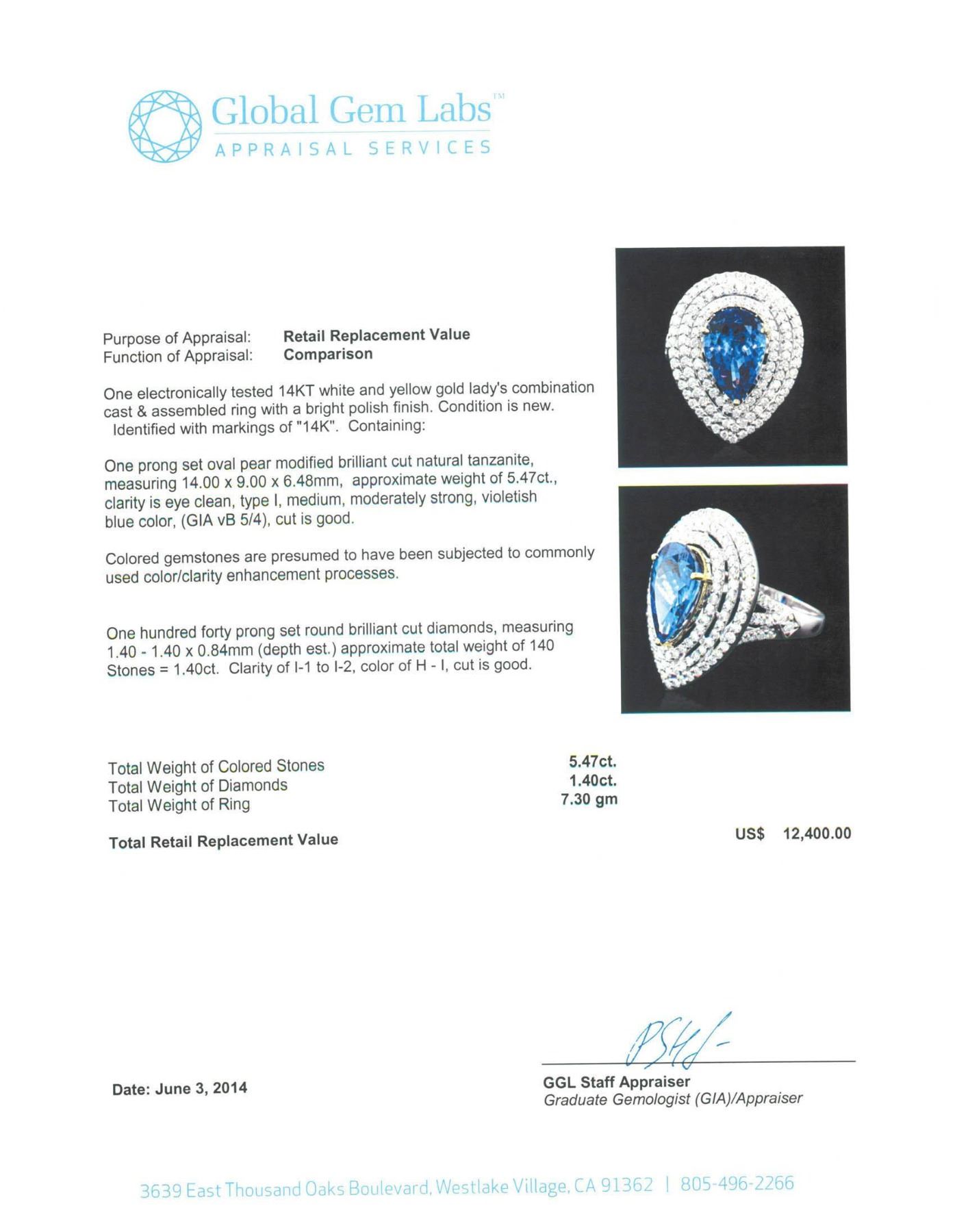 One electronically tested 14KT white and yellow gold Ladies combination cast & assembled ring with a bright polish finish. Condition is new. Identified with markings of "14K". Containing: One prong set oval pear modified brilliant cut natural tanzanite, measuring 14.00 x 9.00 x 6.48mm, approximate weight of 5.47ct., clarity is eye clean, type I, medium, moderately strong, violetish blue color, (GIA vB 5/4), cut is good. Colored gemstones are presumed to have been subjected to commonly used color/clarity enhancement processes. One Hundred Forty prong set round brilliant cut diamonds, measuring 1.40 - 1.40 x 0.84mm (depth est.) approximate. Total Weight of 140 Stones = 1.40 ct. Clarity: I-1 to I-2. Color: H - I, Cut is Good. Total Weight of Colored Stones 5.47ct. Total Weight of Diamonds 1.40 ct. Total Weight of Ring 7.30 grams. GGL Appraised.