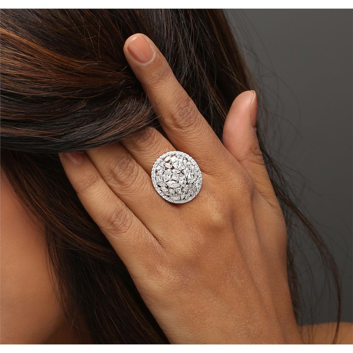 One electronically tested 14KT rose and white gold ladies combination cast & assembled diamond ring with a split shoulder shank with a bright polish finish. Identified with markings of "14K". Condition is new. Containing: Five prong set marquise shaped cut diamonds, measuring 5.50 x 3.00 x 1.89mm (depth est.) approximate total weight of 5 Stones = 0.96ct. Clarity: SI-1. Color: I - J, Cut is Good. Sixteen prong set marquise shaped cut diamonds, measuring 3.20 x 1.60 x 1.01mm (depth est.) approximate total weight of 16 Stones = 0.80ct. Clarity: SI-1. Color: I, Cut is Good. Two prong set pear shaped cut diamonds, measuring 3.50 x 2.90 x 1.83mm (depth est.) approximate total weight of 2 Stones = 0.40ct. Clarity: SI-1. Color: I, Cut is Good. Three prong set princess cut diamonds, measuring 2.50 x 2.40 x 1.80mm (depth est.) approximate total weight of 3 Stones = 0.27ct. Clarity: SI-1. Color: I, Cut is Good. Four prong set shield cut diamonds, measuring 3.20 x 2.50 x 0.00mm (depth est.) approximate total weight of 4 Stones = 0.40ct. Clarity: SI-1. Color: I, Cut is Good. Seventy-Two prong set round brilliant cut diamonds, measuring 1.30 - 1.30 x 0.78mm (depth est.) approximate total weight of 72 Stones = 2.78ct. Clarity: SI-1 to SI-2. Color: I - J, Cut is Good. All diamonds are graded in the mounting, unless otherwise stated. Total Weight of Diamonds 5.61ct. Total Weight of Ring 6.90 grams. GGL Appraised at $13,795.00.