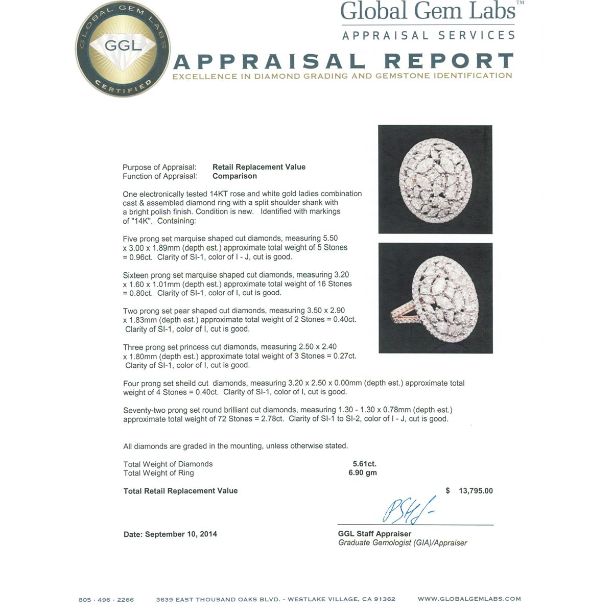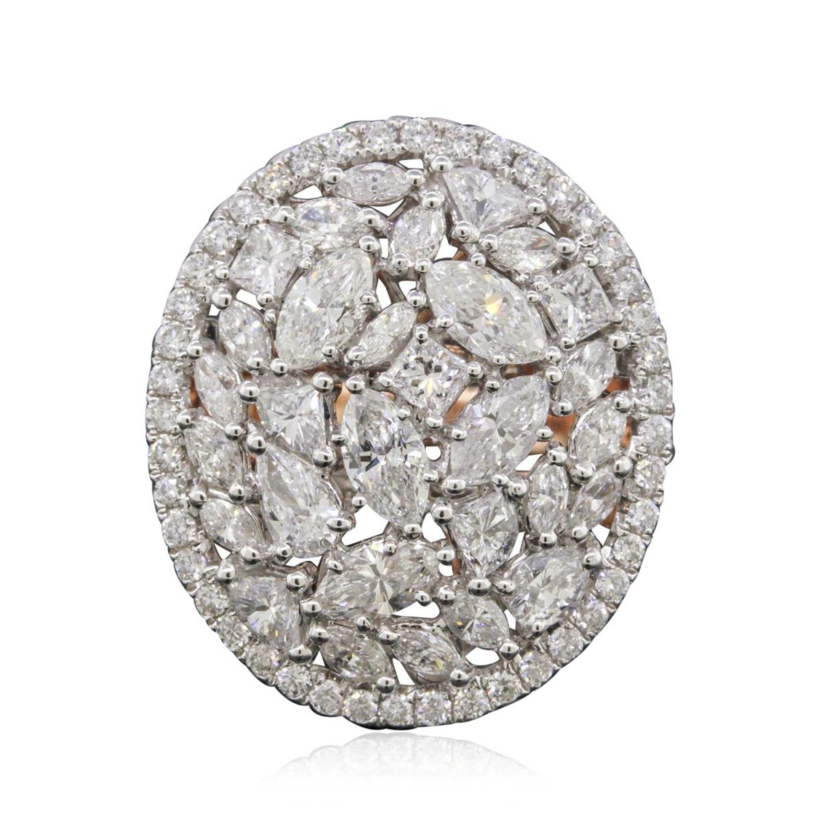 One electronically tested 14KT rose and white gold ladies combination cast & assembled diamond ring with a split shoulder shank with a bright polish finish. Identified with markings of "14K". Condition is new. Containing: Five prong set marquise shaped cut diamonds, measuring 5.50 x 3.00 x 1.89mm (depth est.) approximate total weight of 5 Stones = 0.96ct. Clarity: SI-1. Color: I - J, Cut is Good. Sixteen prong set marquise shaped cut diamonds, measuring 3.20 x 1.60 x 1.01mm (depth est.) approximate total weight of 16 Stones = 0.80ct. Clarity: SI-1. Color: I, Cut is Good. Two prong set pear shaped cut diamonds, measuring 3.50 x 2.90 x 1.83mm (depth est.) approximate total weight of 2 Stones = 0.40ct. Clarity: SI-1. Color: I, Cut is Good. Three prong set princess cut diamonds, measuring 2.50 x 2.40 x 1.80mm (depth est.) approximate total weight of 3 Stones = 0.27ct. Clarity: SI-1. Color: I, Cut is Good. Four prong set shield cut diamonds, measuring 3.20 x 2.50 x 0.00mm (depth est.) approximate total weight of 4 Stones = 0.40ct. Clarity: SI-1. Color: I, Cut is Good. Seventy-Two prong set round brilliant cut diamonds, measuring 1.30 - 1.30 x 0.78mm (depth est.) approximate total weight of 72 Stones = 2.78ct. Clarity: SI-1 to SI-2. Color: I - J, Cut is Good. All diamonds are graded in the mounting, unless otherwise stated. Total Weight of Diamonds 5.61ct. Total Weight of Ring 6.90 grams. GGL Appraised at $13,795.00.