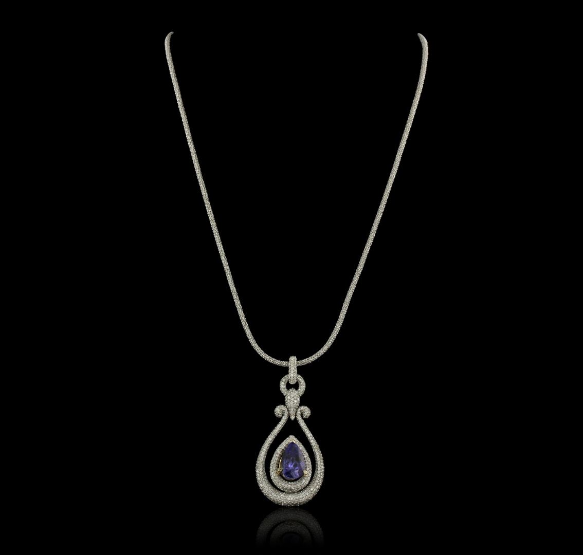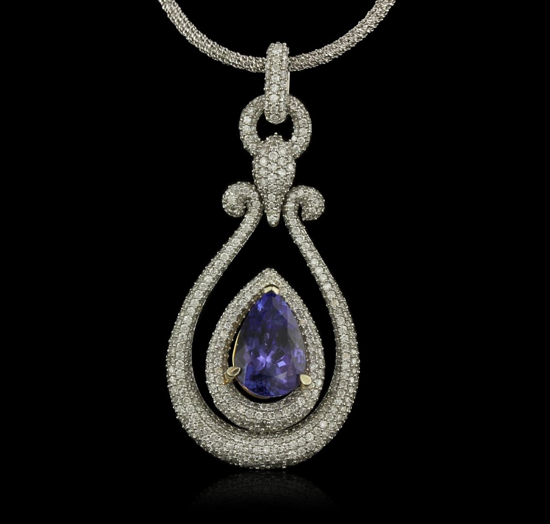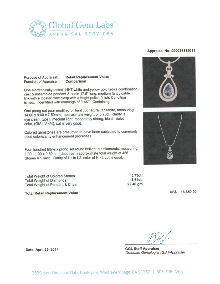One electronically tested 14KT white and yellow gold Ladies combination cast & assembled pendant & chain 17.5" long, medium fancy cable link with a lobster claw clasp with a bright polish finish. Condition is new. Identified with markings of "14K". Containing: One prong set pear modified brilliant cut natural tanzanite, measuring 14.00 x 9.00 x 7.50mm, approximate weight of 5.73ct., clarity is eye clean, type I, medium light, moderately strong, bluish violet color, (GIA bV 4/4), cut is very good. Colored gemstones are presumed to have been subjected to commonly used color/clarity enhancement processes. Four Hundred Fifty-Six prong set round brilliant cut diamonds, measuring 1.00 - 1.00 x 0.60mm (depth est.) approximate. Total Weight of 456 Stones = 1.64ct. Clarity: I-1 to I-2. Color: H - I, Cut is Good. Total Weight of Colored Stones 5.73ct. Total Weight of Diamonds 1.64ct. Total Weight of Pendant & Chain 22.40 grams. GGL Appraised at $18,650.00.