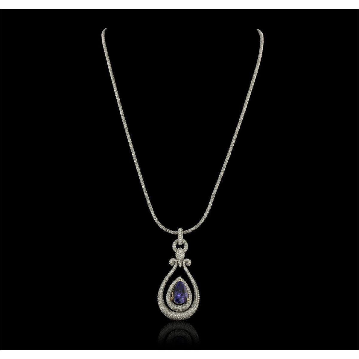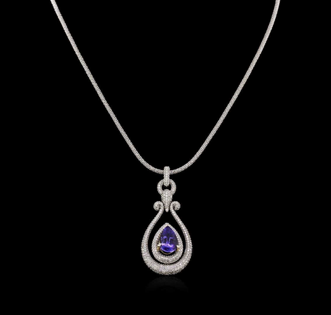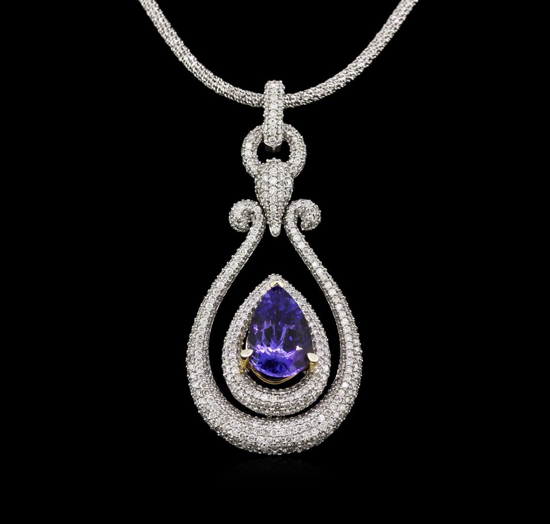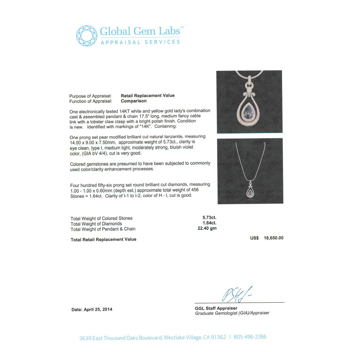 One electronically tested 14KT white and yellow gold Ladies combination cast & assembled pendant & chain 17.5" long, medium fancy cable link with a lobster claw clasp with a bright polish finish. Condition is new. Identified with markings of "14K". Containing: One prong set pear modified brilliant cut natural tanzanite, measuring 14.00 x 9.00 x 7.50mm, approximate weight of 5.73ct., clarity is eye clean, type I, medium light, moderately strong, bluish violet color, (GIA bV 4/4), cut is very good. Colored gemstones are presumed to have been subjected to commonly used color/clarity enhancement processes. Four Hundred Fifty-Six prong set round brilliant cut diamonds, measuring 1.00 - 1.00 x 0.60mm (depth est.) approximate. Total Weight of 456 Stones = 1.64ct. Clarity: I-1 to I-2. Color: H - I, Cut is Good. Total Weight of Colored Stones 5.73ct. Total Weight of Diamonds 1.64ct. Total Weight of Pendant & Chain 22.40 grams. GGL Appraised at $18,650.00.