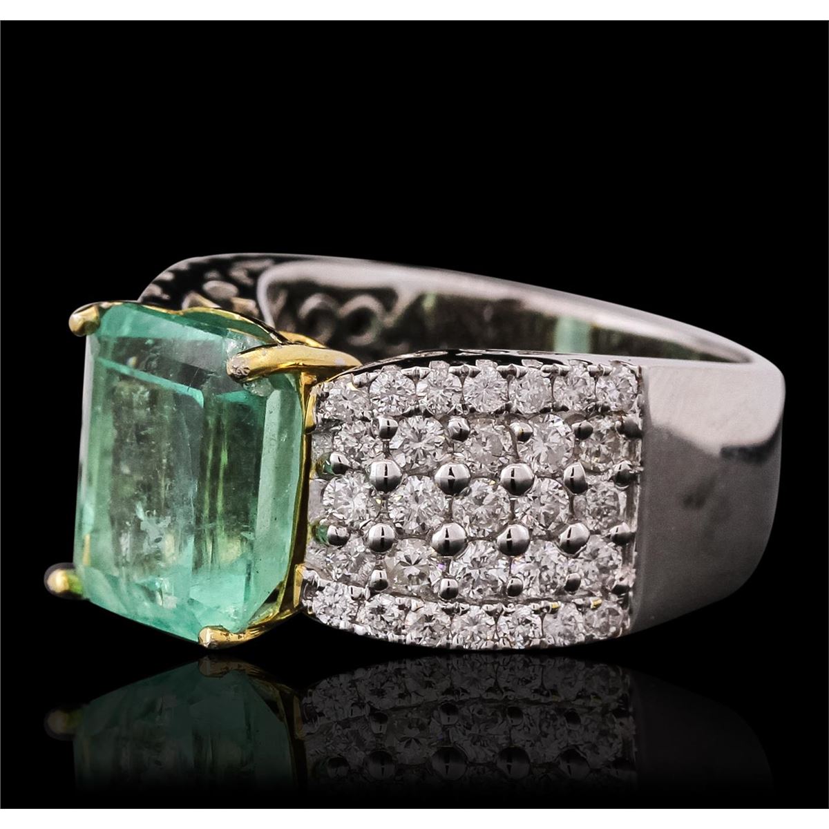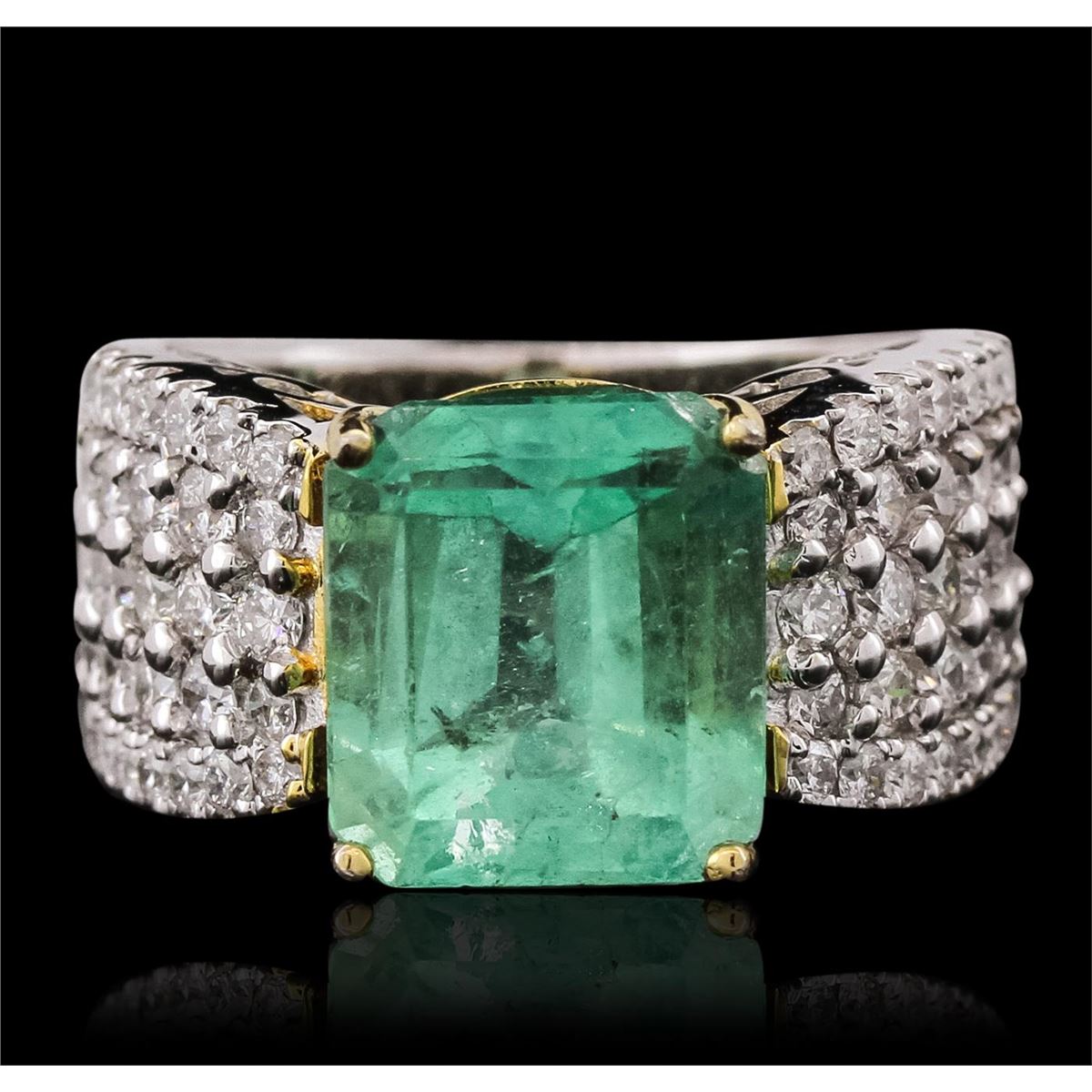 One electronically tested 14KT white and yellow gold ladies combination cast & assembled emerald and diamond ring with a flat shank with a bright polish finish. Identified with markings of "14K". Condition is new. Containing: One prong set emerald standard step cut natural emerald, measuring 11.03 x 9.73 x 7.57mm, approximate weight of 5.97ct., clarity is heavily included, type III, light, very slightly grayish, bluish green color, (GIA bG 3/3), cut is good. Fifty-Eight prong set round brilliant cut diamonds, measuring 1.90 - 1.50 x 1.02mm (depth est.) approximate total weight of 58 Stones = 1.04ct. Clarity: SI-2 to I-2. Color: I - J, Cut is Good. Colored gemstones are presumed to have been subjected to commonly used enhancement processes. All diamonds and colored gemstones are graded in the mounting, unless otherwise stated total weight of Colored Stones 5.97ct. Total Weight of Diamonds 1.04ct. Total Weight of Ring 10.00 grams. GGL Appraised at $17,130.00.