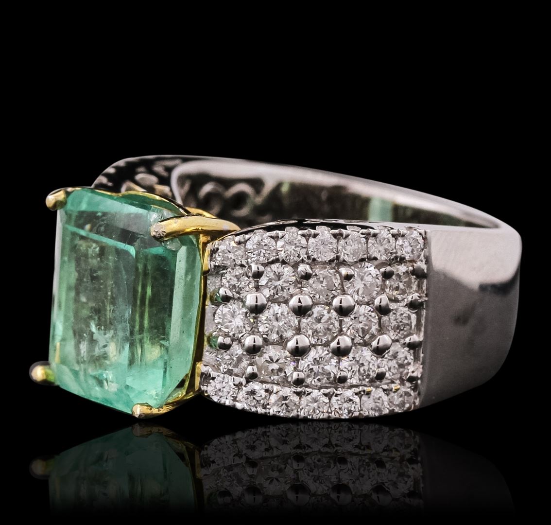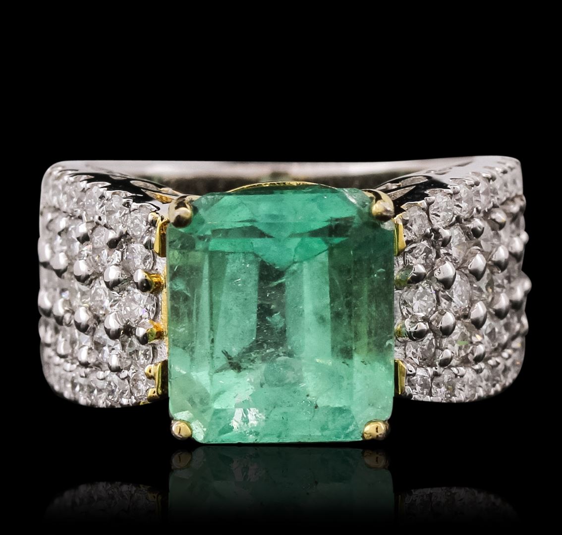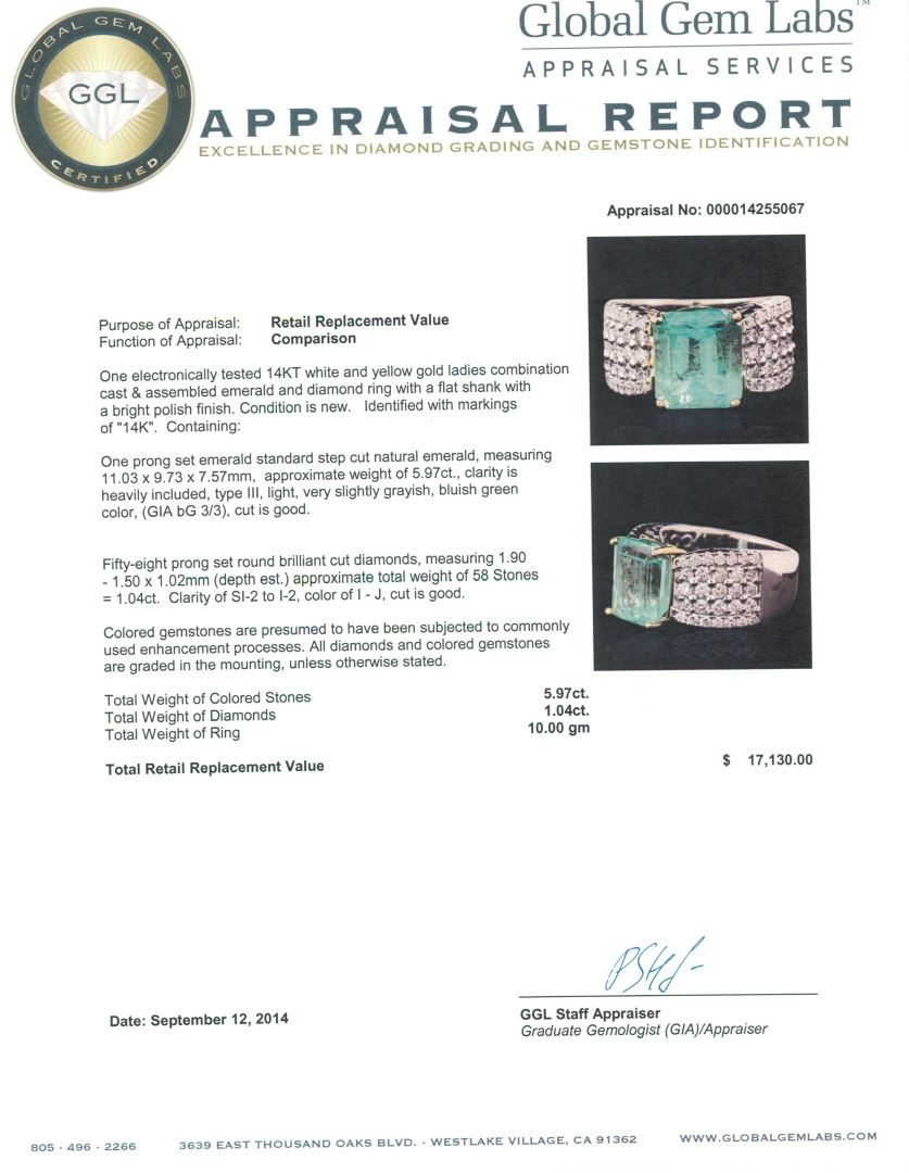 One electronically tested 14KT white and yellow gold ladies combination cast & assembled emerald and diamond ring with a flat shank with a bright polish finish. Identified with markings of "14K". Condition is new. Containing: One prong set emerald standard step cut natural emerald, measuring 11.03 x 9.73 x 7.57mm, approximate weight of 5.97ct., clarity is heavily included, type III, light, very slightly grayish, bluish green color, (GIA bG 3/3), cut is good. Fifty-Eight prong set round brilliant cut diamonds, measuring 1.90 - 1.50 x 1.02mm (depth est.) approximate total weight of 58 Stones = 1.04ct. Clarity: SI-2 to I-2. Color: I - J, Cut is Good. Colored gemstones are presumed to have been subjected to commonly used enhancement processes. All diamonds and colored gemstones are graded in the mounting, unless otherwise stated total weight of Colored Stones 5.97ct. Total Weight of Diamonds 1.04ct. Total Weight of Ring 10.00 grams. GGL Appraised at $17,130.00.