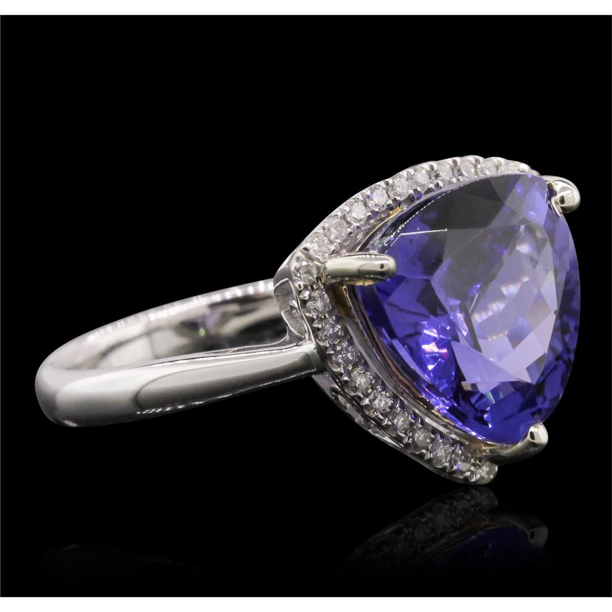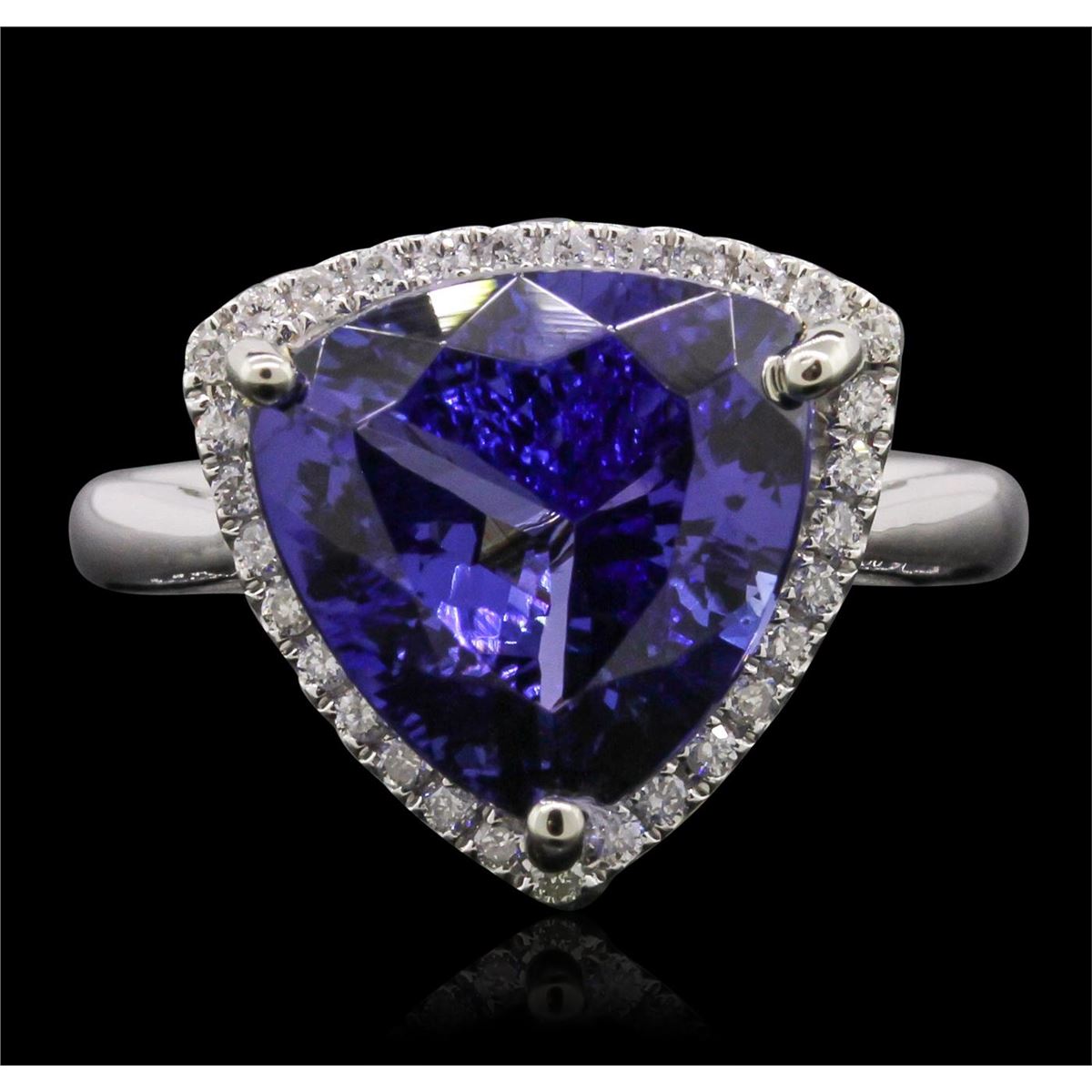 One electronically tested 14KT white and yellow gold Ladies combination cast & assembled fashion ring with a bright polish finish. Condition is new. Identified with markings of "14K". Containing: One prong set triangle modified mixed cut natural tanzanite, measuring 11.70 x 11.70 x 7.10mm, approximate weight of 6.18ct., clarity is eye clean, type I, medium, moderately strong, blue color, (GIA B 5/4), cut is very good. Colored gemstones are presumed to have been subjected to commonly used and possible undetectable color/clarity enhancement processes. Thirty prong set round brilliant cut diamonds, measuring 1.20 - 1.20 x 0.72mm (depth est.) approximate. Total Weight of 30 Stones = 0.25ct. Clarity: I-1 to I-2. Color: I - J, Cut is Good. Total Weight of Colored Stones 6.18ct. Total Weight of Diamonds 0.25ct. Total Weight of Ring 5.00 grams. GGL Appraised at $11,060.00.