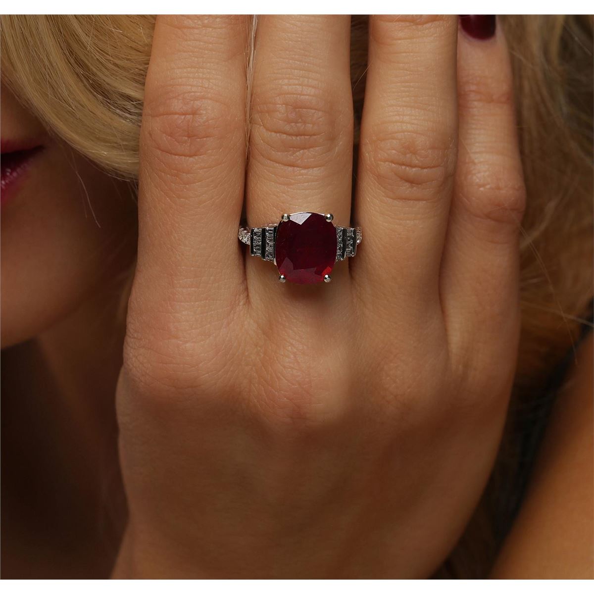One electronically tested 14KT white and yellow gold ladies combination cast & assembled ruby and diamond ring with a flat shank with a bright polish finish. Identified with markings of "14K". Condition is new. Containing: One prong set oval modified brilliant cut natural ruby, measuring 12.07 x 10.21 x 6.33mm, approximate weight of 6.28ct., clarity is heavily included, type II, medium dark, moderately strong, strongly purplish red color, (GIA stpR 6/4), cut is good. Eight prong set round brilliant cut diamonds, measuring 1.90 - 1.90 x 1.14mm (depth est.) approximate total weight of 8 Stones = 0.20ct. Clarity: SI-2 to I-1. Color: I - J, Cut is Good. Eighteen channel set baguette cut diamonds, measuring 1.50 x 1.00 x 0.85mm (depth est.) approximate total weight of 18 Stones = 0.21ct. Clarity: SI-1 to SI-2. Color: J, Cut is Good. Colored gemstones are presumed to have been subjected to commonly used enhancement processes. All diamonds and colored gemstones are graded in the mounting, unless otherwise stated. Total Weight of Colored Stones 6.28ct. Total Weight of Diamonds 0.41ct. Total Weight of Ring 5.60 grams. GGL Appraised at $5,190.00.