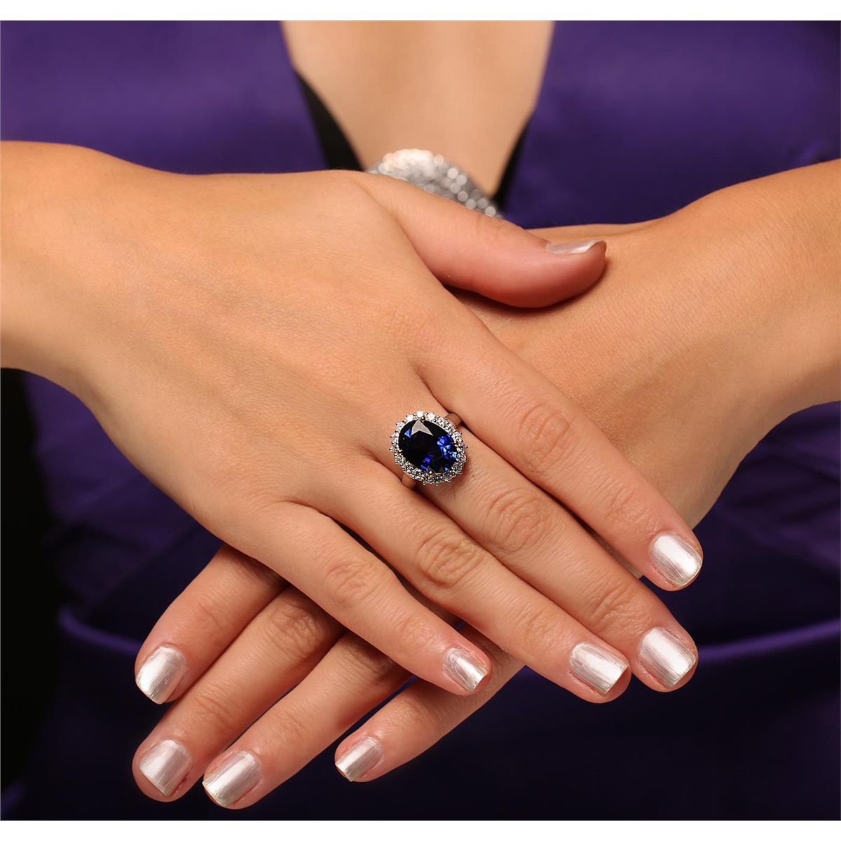 One electronically tested 14KT white and yellow gold Ladies combination cast & assembled ring with a bright polish finish. Condition is new. Identified with markings of "14K". Containing: Eighteen prong set round brilliant cut diamonds,measuring 2.00 - 2.00 x 1.20mm (depth est.)approximate total weight of 18 Stones = 0.53ct. Clarity of I-1 to I-2, color of I - K, cut is good. One prong set oval modified brilliant cut natural tanzanite, measuring 13.10 x 10.0 x 5.80mm, exact weight 6.57ct., clarity is eye clean, type I, medium, very slightly grayish, violetish blue color, (GIA vB 5/3), cut is very good. Colored gemstones are presumed to have been subjected to commonly used color/clarity enhancement processes. Total Weight of Colored Stones 6.57ct. Total Weight of Diamonds 0.53ct. Total Weight of Ring 8.00gm. GGL Appraised at $12,120.00.