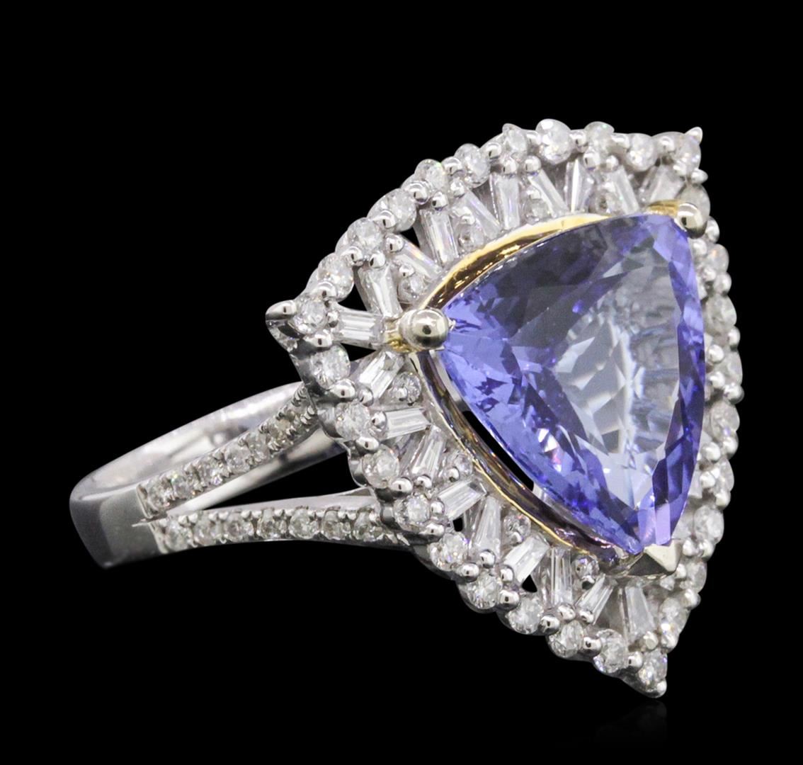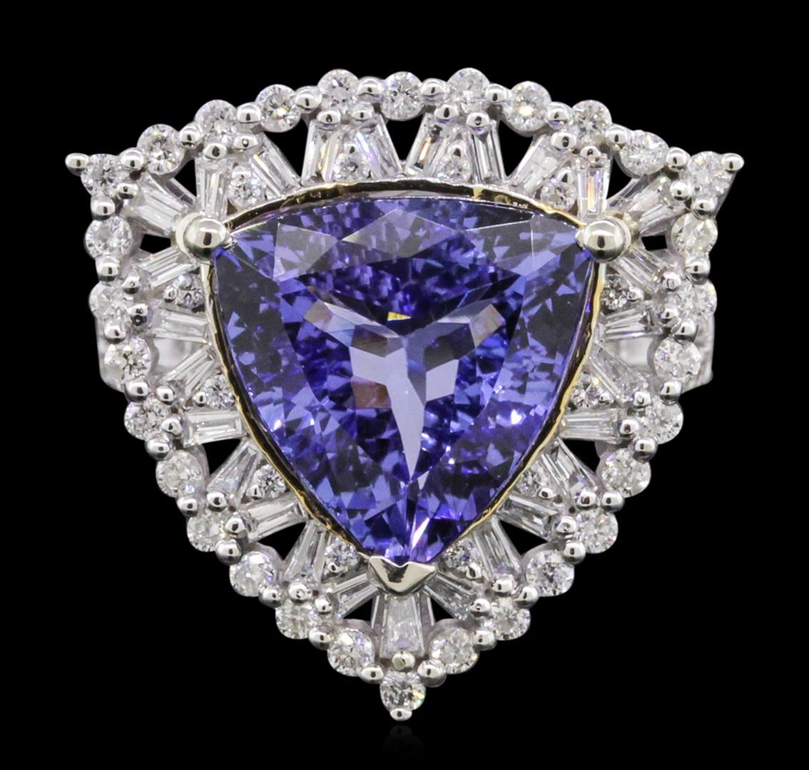 One electronically tested 14KT white and yellow gold ladies combination cast & assembled tanzanite and diamond ring with a flat shank with a bright polish finish. Identified with markings of "14K". Condition is new. Containing: One prong set triangle modified brilliant cut natural tanzanite, measuring 13.41 x 13.41 x 6.13mm, approximate weight of 6.65ct., clarity is eye clean, type I, medium light, moderately strong, bluish violet color, (GIA bV 4/4), cut is good. Seventy prong set round brilliant cut diamonds, measuring 1.50 - 1.10 x 0.78mm (depth est.) approximate total weight of 70 Stones = 0.56ct. Clarity: SI-2 to I-1. Color: H - I, Cut is Good. Twenty-Six prong set baguette cut diamonds, measuring 2.00 x 1.10 x 0.94mm (depth est.) approximate total weight of 26 Stones = 0.49ct. Clarity: SI-1 to SI-2. Color: H - I, Cut is Good. Colored gemstones are presumed to have been subjected to commonly used enhancement processes. All diamonds and colored gemstones are graded in the mounting, unless otherwise stated. Total Weight of Colored Stones 6.65ct. Total Weight of Diamonds 1.05ct. Total Weight of Ring 7.50 grams. GGL Appraised at $14,760.00.