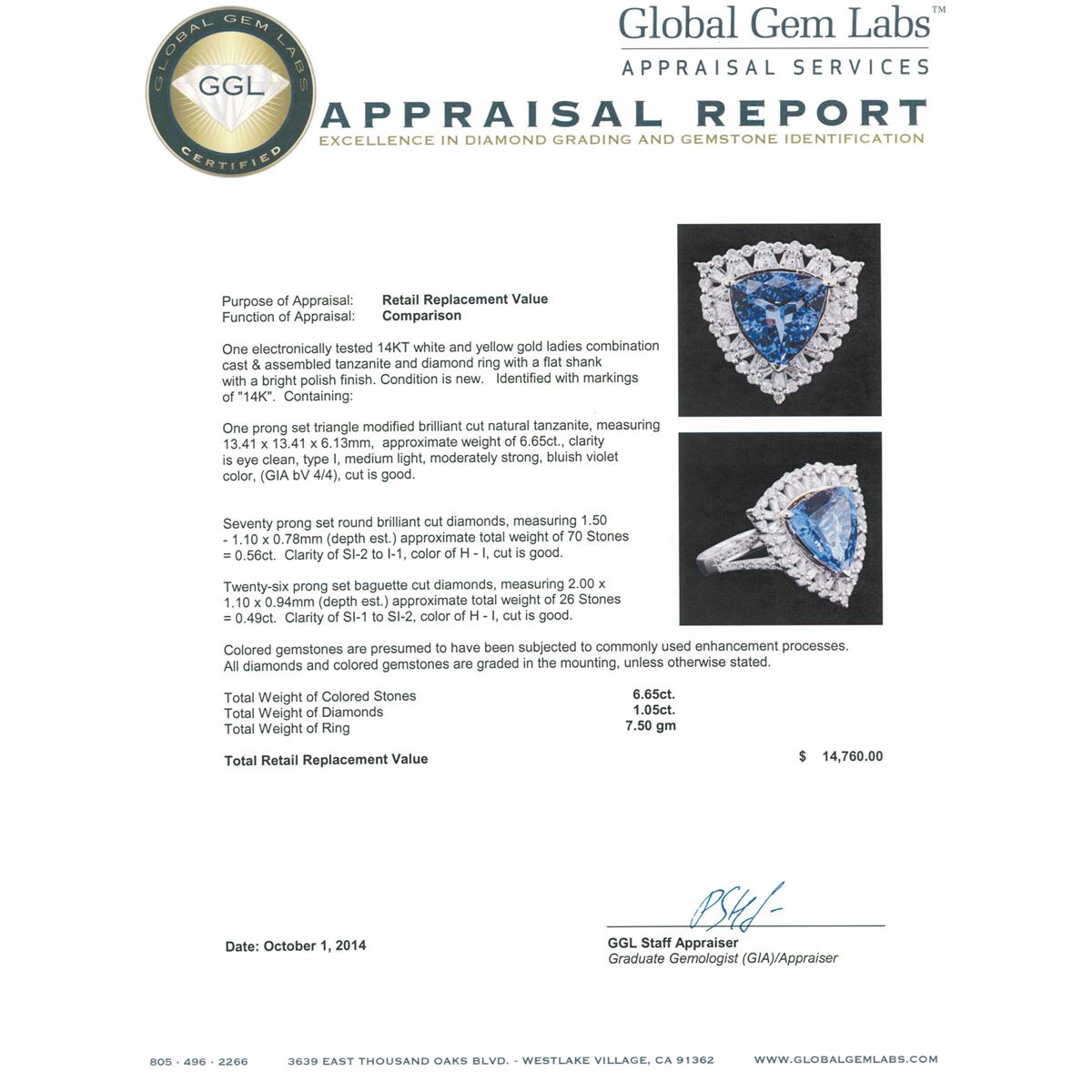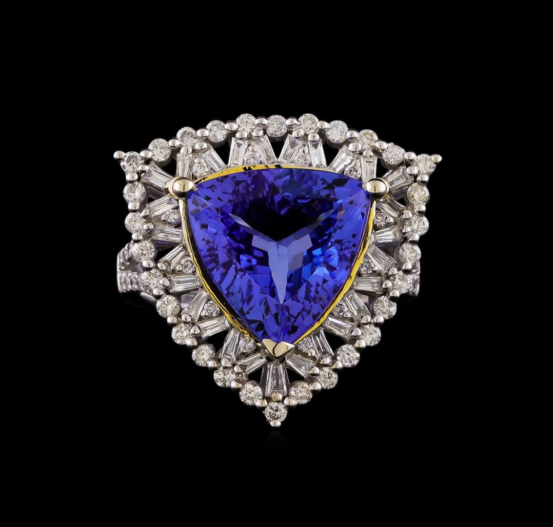 One electronically tested 14KT white and yellow gold ladies combination cast & assembled tanzanite and diamond ring with a flat shank with a bright polish finish. Identified with markings of "14K". Condition is new. Containing: One prong set triangle modified brilliant cut natural tanzanite, measuring 13.41 x 13.41 x 6.13mm, approximate weight of 6.65ct., clarity is eye clean, type I, medium light, moderately strong, bluish violet color, (GIA bV 4/4), cut is good. Seventy prong set round brilliant cut diamonds, measuring 1.50 - 1.10 x 0.78mm (depth est.) approximate total weight of 70 Stones = 0.56ct. Clarity: SI-2 to I-1. Color: H - I, Cut is Good. Twenty-Six prong set baguette cut diamonds, measuring 2.00 x 1.10 x 0.94mm (depth est.) approximate total weight of 26 Stones = 0.49ct. Clarity: SI-1 to SI-2. Color: H - I, Cut is Good. Colored gemstones are presumed to have been subjected to commonly used enhancement processes. All diamonds and colored gemstones are graded in the mounting, unless otherwise stated. Total Weight of Colored Stones 6.65ct. Total Weight of Diamonds 1.05ct. Total Weight of Ring 7.50 grams. GGL Appraised at $14,760.00.