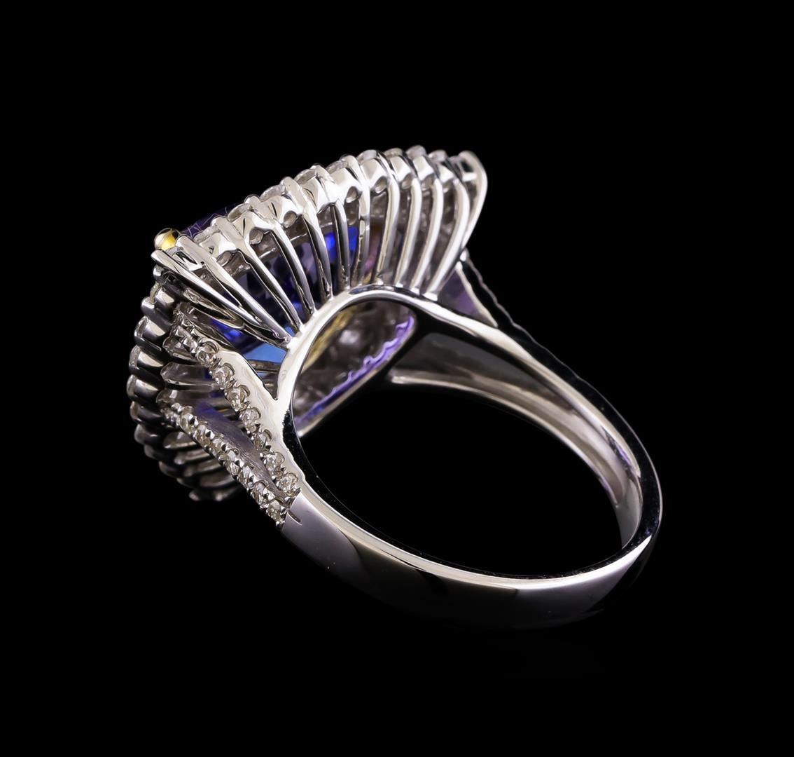 One electronically tested 14KT white and yellow gold ladies combination cast & assembled tanzanite and diamond ring with a flat shank with a bright polish finish. Identified with markings of "14K". Condition is new. Containing: One prong set triangle modified brilliant cut natural tanzanite, measuring 13.41 x 13.41 x 6.13mm, approximate weight of 6.65ct., clarity is eye clean, type I, medium light, moderately strong, bluish violet color, (GIA bV 4/4), cut is good. Seventy prong set round brilliant cut diamonds, measuring 1.50 - 1.10 x 0.78mm (depth est.) approximate total weight of 70 Stones = 0.56ct. Clarity: SI-2 to I-1. Color: H - I, Cut is Good. Twenty-Six prong set baguette cut diamonds, measuring 2.00 x 1.10 x 0.94mm (depth est.) approximate total weight of 26 Stones = 0.49ct. Clarity: SI-1 to SI-2. Color: H - I, Cut is Good. Colored gemstones are presumed to have been subjected to commonly used enhancement processes. All diamonds and colored gemstones are graded in the mounting, unless otherwise stated. Total Weight of Colored Stones 6.65ct. Total Weight of Diamonds 1.05ct. Total Weight of Ring 7.50 grams. GGL Appraised at $14,760.00.